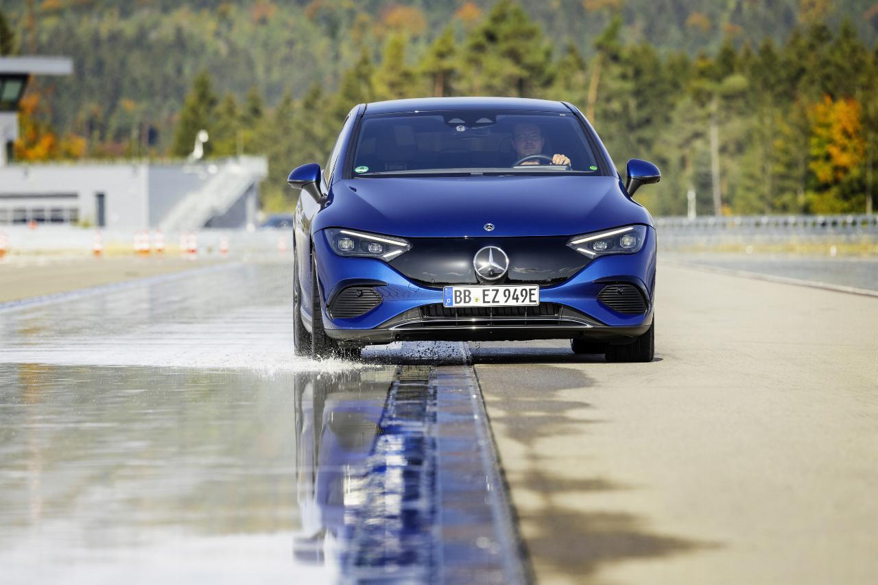 Wahre Höchstleistungen vollbringt das integrierte System aber erst, wenn die Fahrbahn nur einseitig griffig durch nasses Herbstlaub oder aufgetaute Schneeränder ausfällt. Wird der Wagen hier zum Ausweichen gezwungen, bedeutet das ohne elektronische Unterstützung unweigerlich einen Abflug in den Straßengraben. Mit aktiviertem System allerdings hält in unserem Fall der EQE unabhängig von Tempo, Fähigkeit und Reaktion des Fahrers stoisch Kurs und bremst kontrolliert bis zum Stillstand herunter. So bleibt auch der ungeübte Fahrer im Wortsinne immer auf der sicheren Seite.