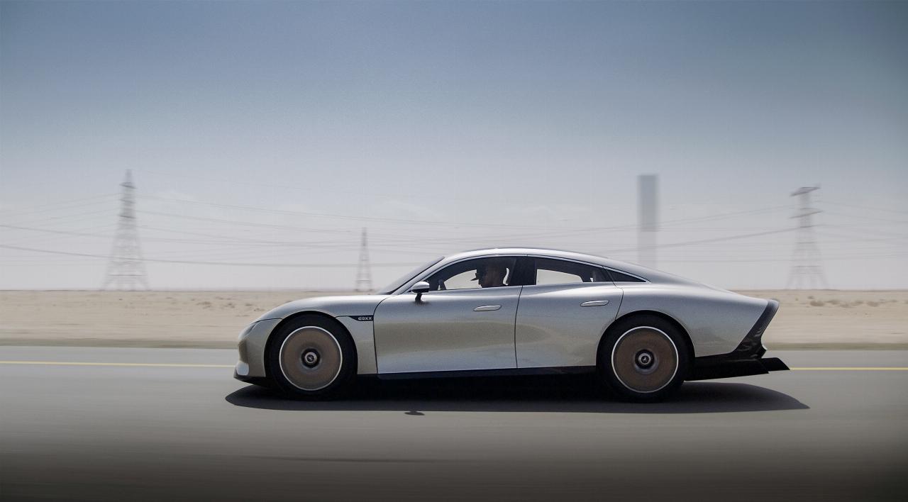 Das sonnenreiche Saudi-Arabien bot den Ingenieuren die Leistung des Solardachs des Vission EQXX genau zu prüfen. Die 117 Solarzellen versorgen diverse Nebenverbraucher mit Strom, was den Energiebedarf des Hochspannungssystems reduziert und die Gesamteffizienz weiter steigert. Auf der Fahrt nach Dubai konnten so 1,8 kWh Solarstrom erzeugt werden, was die Reichweite um rund 24 Kilometer erhöhte. (aum)