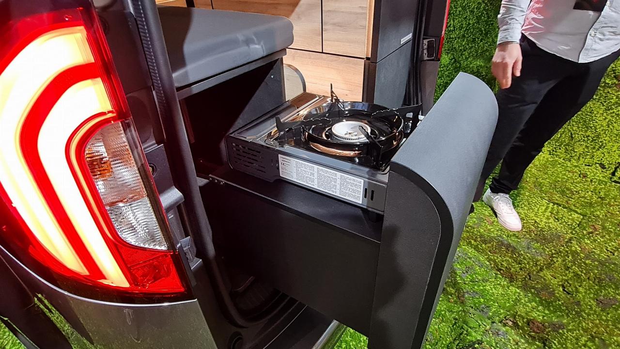 Das Platzangebot wird wesentlich von dem geprägt, was Wettbewerber wie der VW Caddy California zumindest ab Werk nicht haben. Ein Hubdach. Das bringt erstens Stehhöhe und zweitens eine Liegefläche von 1,15 mal 2 Meter im Oberstübchen. Unten sorgen clever gestaltete Möbel für Variabilität. Schubladenmodule auf der rechten Fahrzeugseite bieten Stauraum und bilden die Basis für einen ausklappbaren Tisch. Bei Bedarf stützt es auch das Bett im Parterre, ebenfalls 1,15 mal 2 Meter groß. Zum Vergleich: im Caddy kommt die Liegeflächen nur auf 1,07 Meter Breite. Zum Kochen dient eine Induktionsplatte und ein weiterer Gasbrenner, der durch die nach oben öffnende Heckklappe erreichbar ist.
