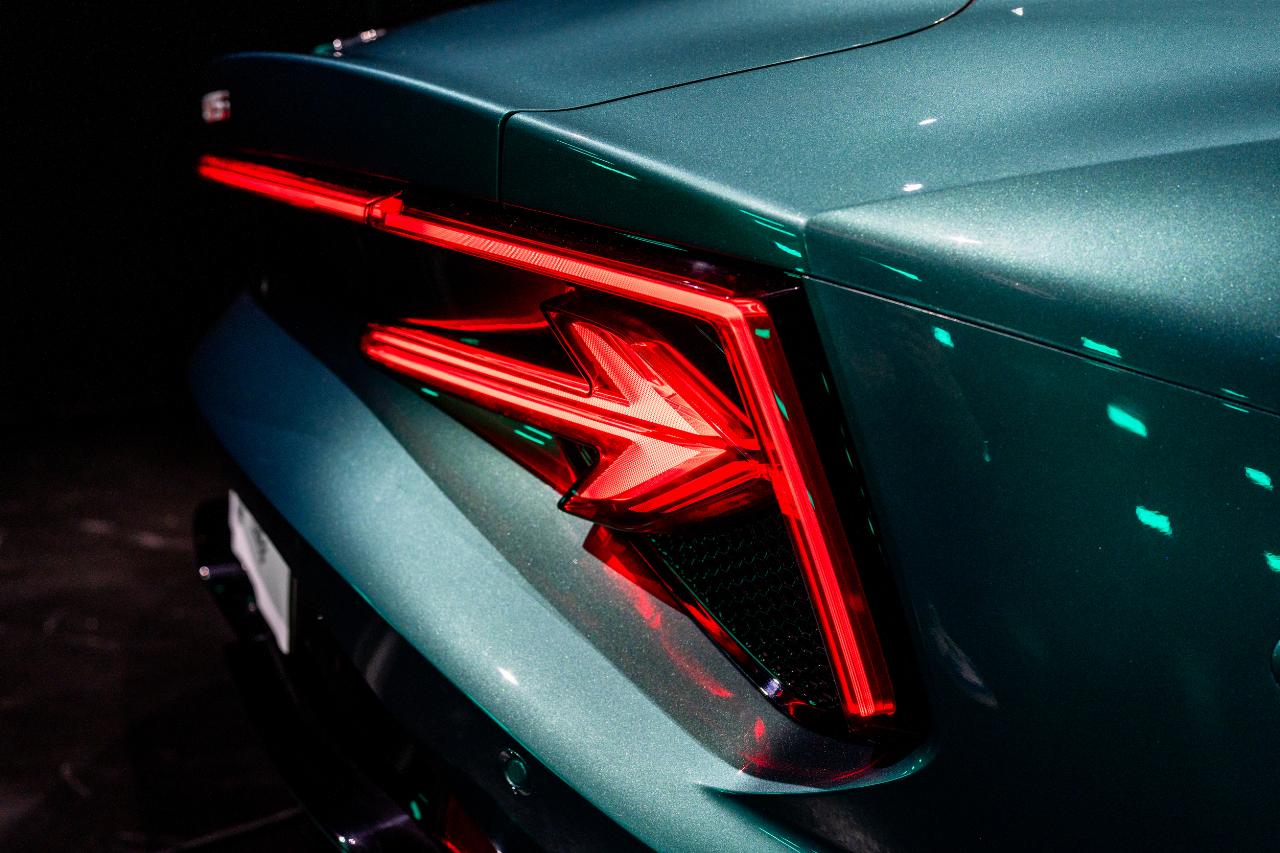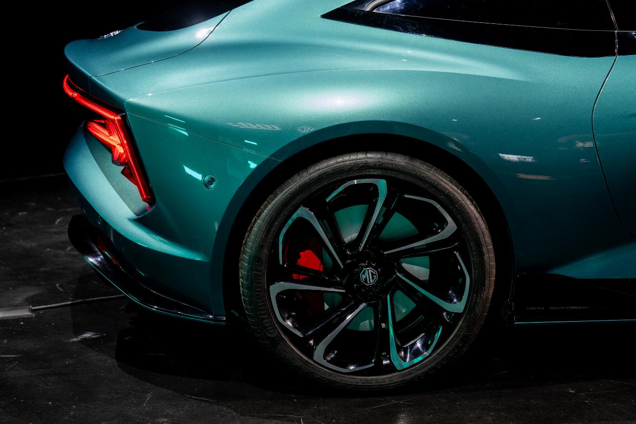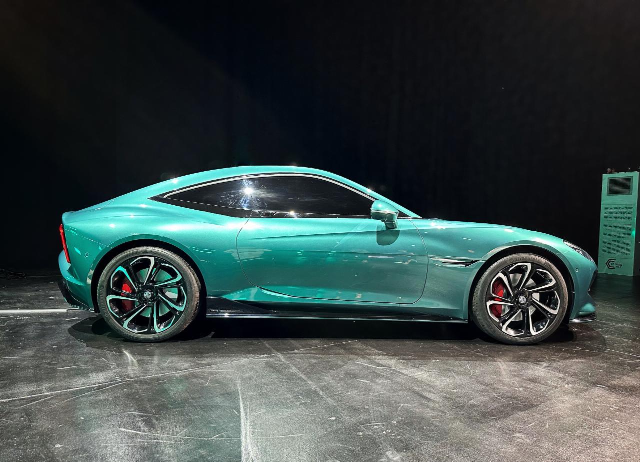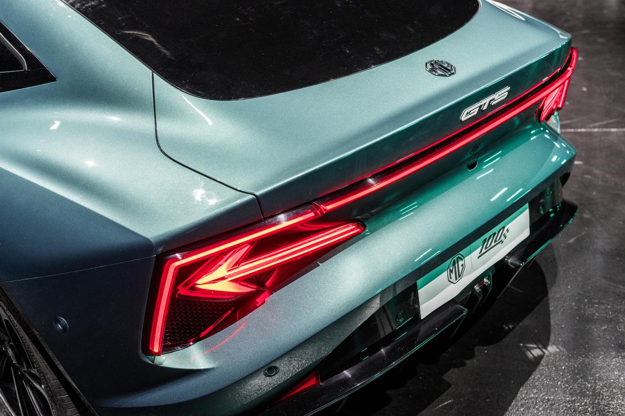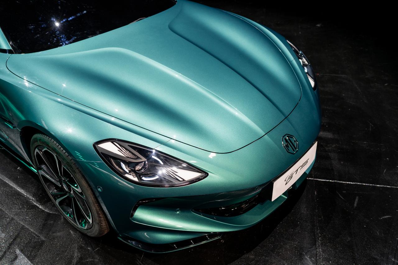 Das kräftige Grünmetallic mit türkisenem Einschlag zitiert das klassische Grün britischer Sportwagen, mischt aber eine futuristische Note bei. Die Nähe dieses MG-Coupés zu Aston Martin oder Jaguar wirkt authentisch. Denn der GTS besitzt nahezu ideale Proportionen, und das ist kein Wunder, weil auch der mit ihm verwandte Cyberster nicht nur offen, sondern auch mit geschlossenem Verdeck stimmig und harmonisch wirkt. Die muskulösen hinteren Kotflügel kommen beim GTS aber noch besser zur Geltung, und die schwarzlackierte Linie unter den Seitenfenstern setzt einen eigenständigen Akzent.