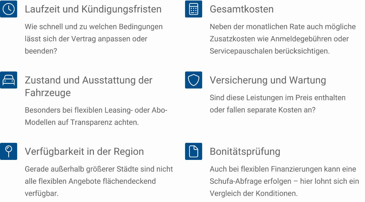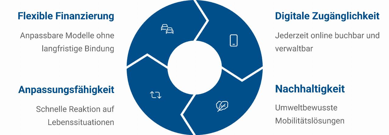 Hier bieten sich alternative Mobilitätsmodelle wie Carsharing, Abo-Modelle oder moderne Finanzierungsmöglichkeiten an. Fragen nach Laufzeit, Kündigungsfristen oder flexiblen Vertragsanpassungen, mit denen auf sich plötzlich änderende Lebensumstände reagiert werden kann, rücken in den Vordergrund. Ebenso Fragen nach den Gesamtkosten oder den inkludierten Serviceleistungen.