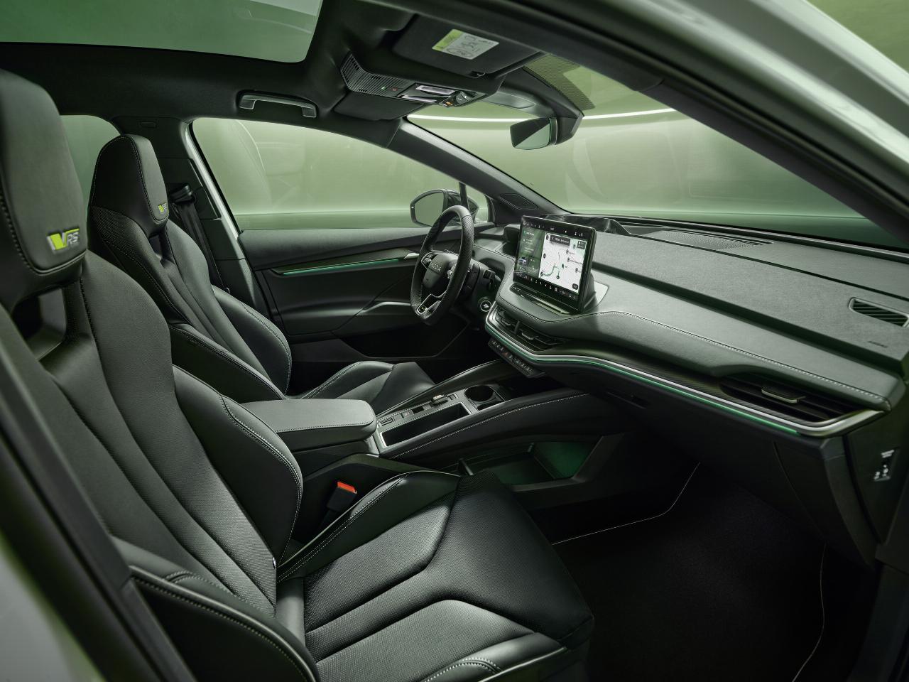 Als Antrieb dienen zwei Elektromotoren an Vorder- und Hinterachse – mit 250 kW (340 PS) Systemleistung und Allradantrieb. So ausgestattet sprinten beide Enyaq RS-Modelle in 5,4 Sekunden von 0 auf 100 km/h, die Spitze wird bei 180 km/h abgeregelt. Eine Progressivlenkung unterstützt die dynamischen Eigenschaften. Für ein agileres Set-Up senkt das Sportfahrwerk die Bodenfreiheit an der Vorderachse um 15 Millimeter und an der Hinterachse um zehn Millimeter.