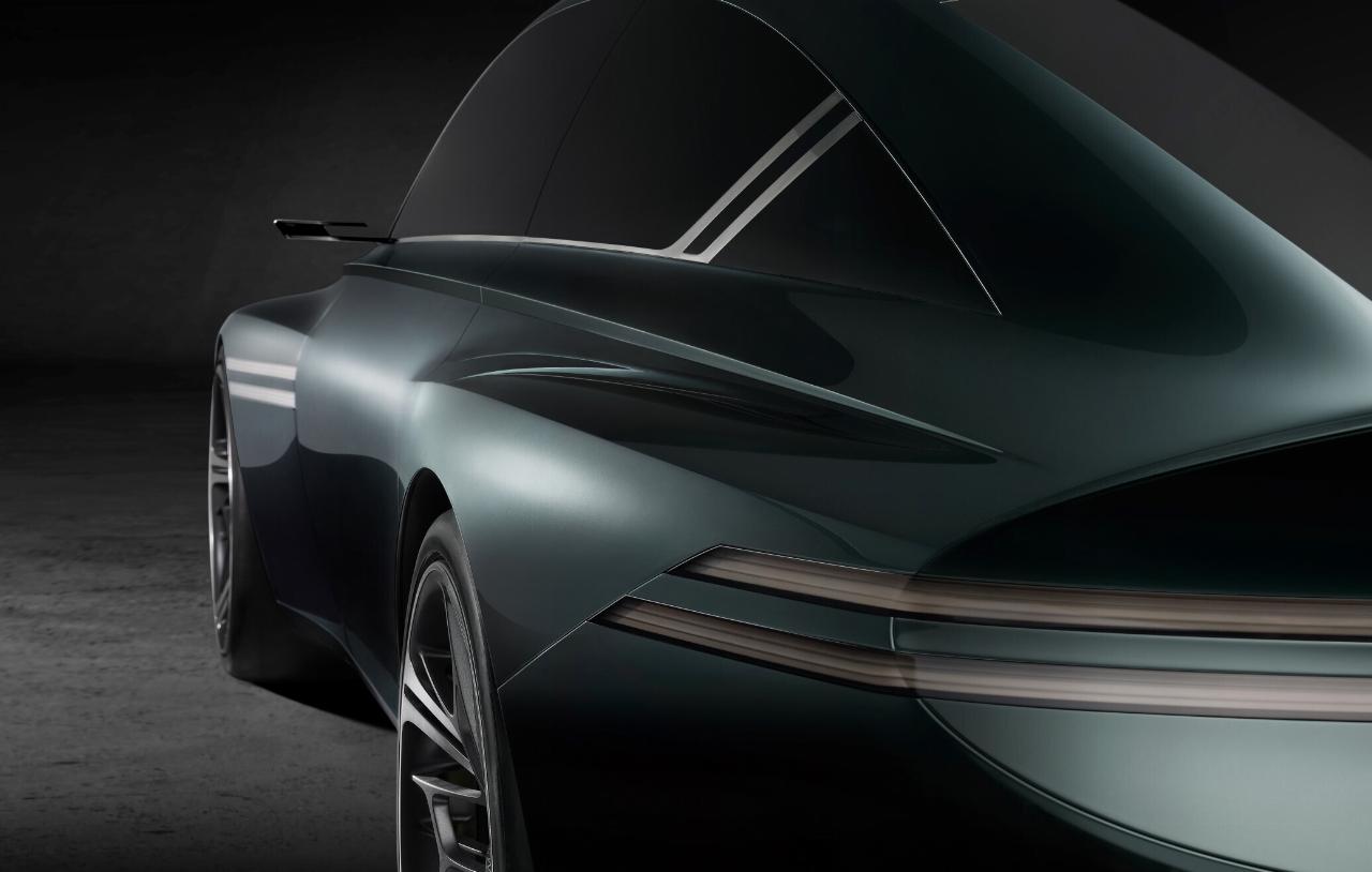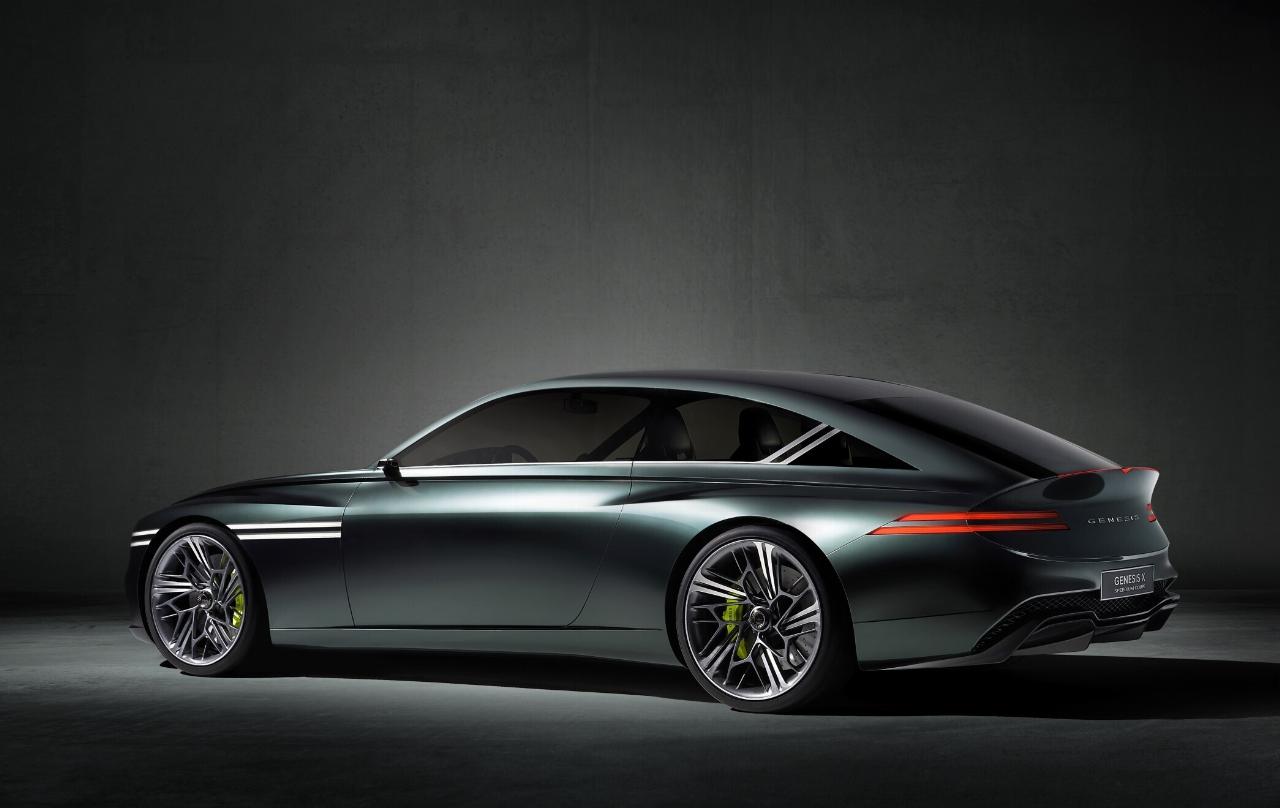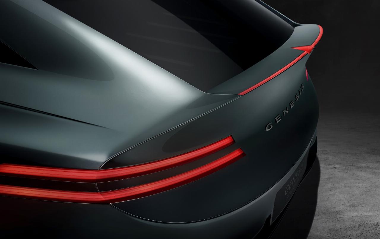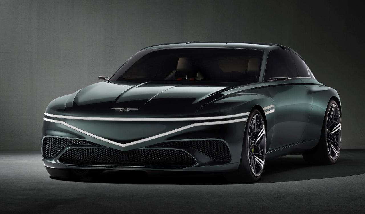 Die Fahrzeugfront zeigt die für Genesis charakteristischen „Zwei-Linien“-Leuchten als ein über die gesamte Breite verlaufendes Element. Es greift die Form des Crest-Frontgrills auf und integriert Tagfahrleuchten, Abblendlicht und Fernlicht zu einer Markensignatur für die Ära der Elektrifizierung. Das Gesicht soll den Wandel von Genesis zu einer reinen Elektroautomarke symbolisieren, die bis 2030 sechs EV-Modelle anbieten wird.