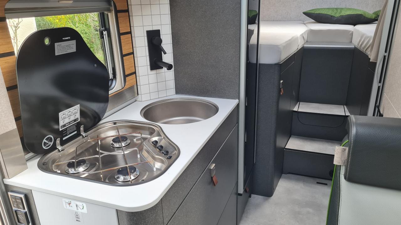 Die Einrichtung ist stilvollendet, viele natürliche Materialien wie etwa Bambus und Filz werden eingesetzt. Stauraum gibt es mehr als ausreichend, nicht zuletzt in der großen Heckgarage. Der ML-T 570 ist auf Autarkie getrimmt. Zwei Solarmodule auf dem Dach laden mit bis zu 190 Watt vier Lithium-Akkus, jeder von ihnen hat 80 Ah. Ein Wechselrichter mit 1800 Watt Leistung macht aus deren Energie 230 Volt Wechselstrom, der Betrieb von Haushaltsgeräten über die vier Bord-Steckdosen ist so möglich.
