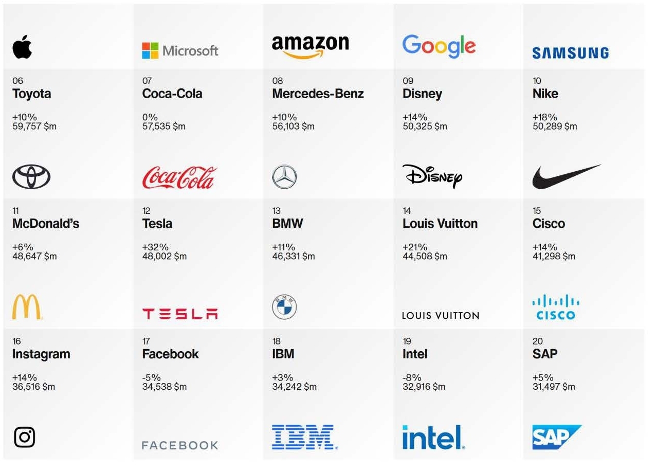 Wenig verwunderlich, dass Apple mit einem Plus von 18 Prozent und einem Markenwert von mehr als 482 Mrd US-Dollar den ersten Platz belegt. Beste Automarke ist Toyota auf Platz 7 (plus 10 Prozent, 59,8 Mrd. US-Dollar). Es folgt Mercedes-Benz Platz 8, auf Platz 12 Tesla mit plus 33 Prozent und 48 Mrd US-Dollar, vor BMW auf Platz 13 mit einem Plus von 3 Prozent und 34,2 Mrd US-Dollar.