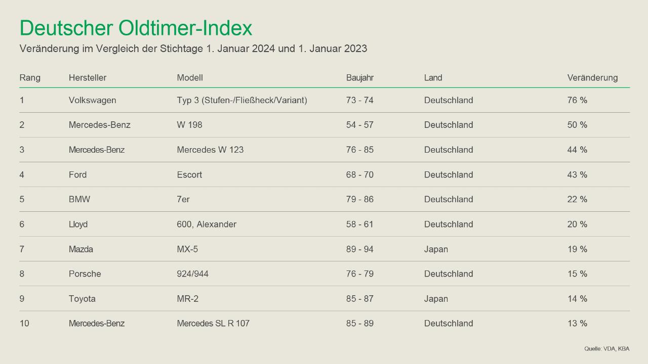 Bei den meisten Old- und Youngtimern handelt es sich um Alltagsfahrzeuge. In den Top Ten finden sich gleich acht Fahrzeuge deutscher Hersteller. Der Wert des einst unbeliebten VW Variant 412 L hat sich am deutlichsten entwickelt. Er verzeichnete einen Preisanstieg um 76 Prozent. Der Mercedes W 198 (Flügeltürer) folgt mit plus 50 Prozent. Direkt dahinter finden sich Alltagsfahrzeuge wie der Mercedes W 123 (plus 44 Prozent), der Ford Escort 1100 aus den Baujahren 1968–1970 (+43 %) und der BMW der 7er Baureihe E23 (+22 %). Es folgen der Lloyd Alexander TS (+20 %) und der Mazda MX-5 (+19 %) sowie der Porsche 924 (+15 %), der Toyota MR 2 (+14 %) und der Mercedes-Benz R 107 (+13 %). Etliche der im Index betrachteten Fahrzeuge haben sich nicht im Preis verändert.