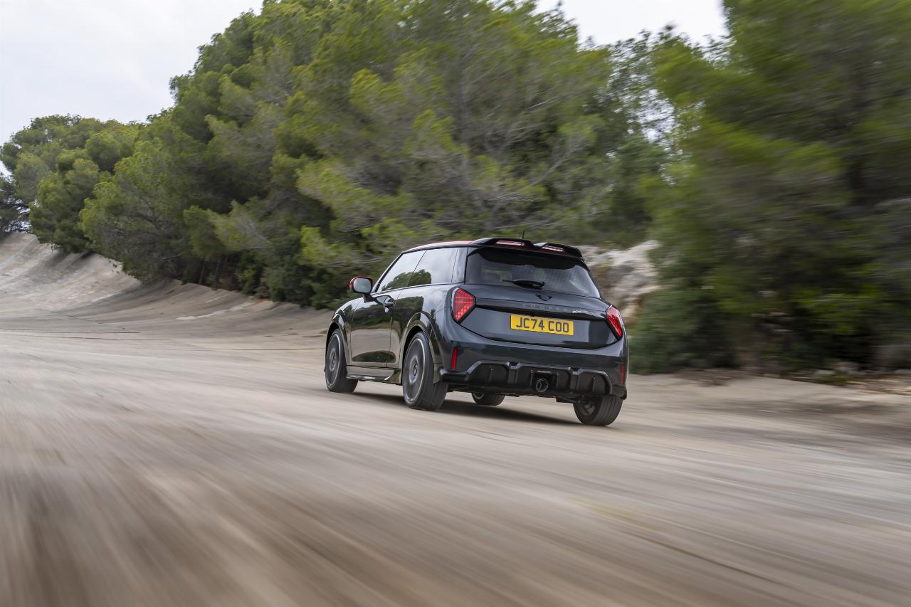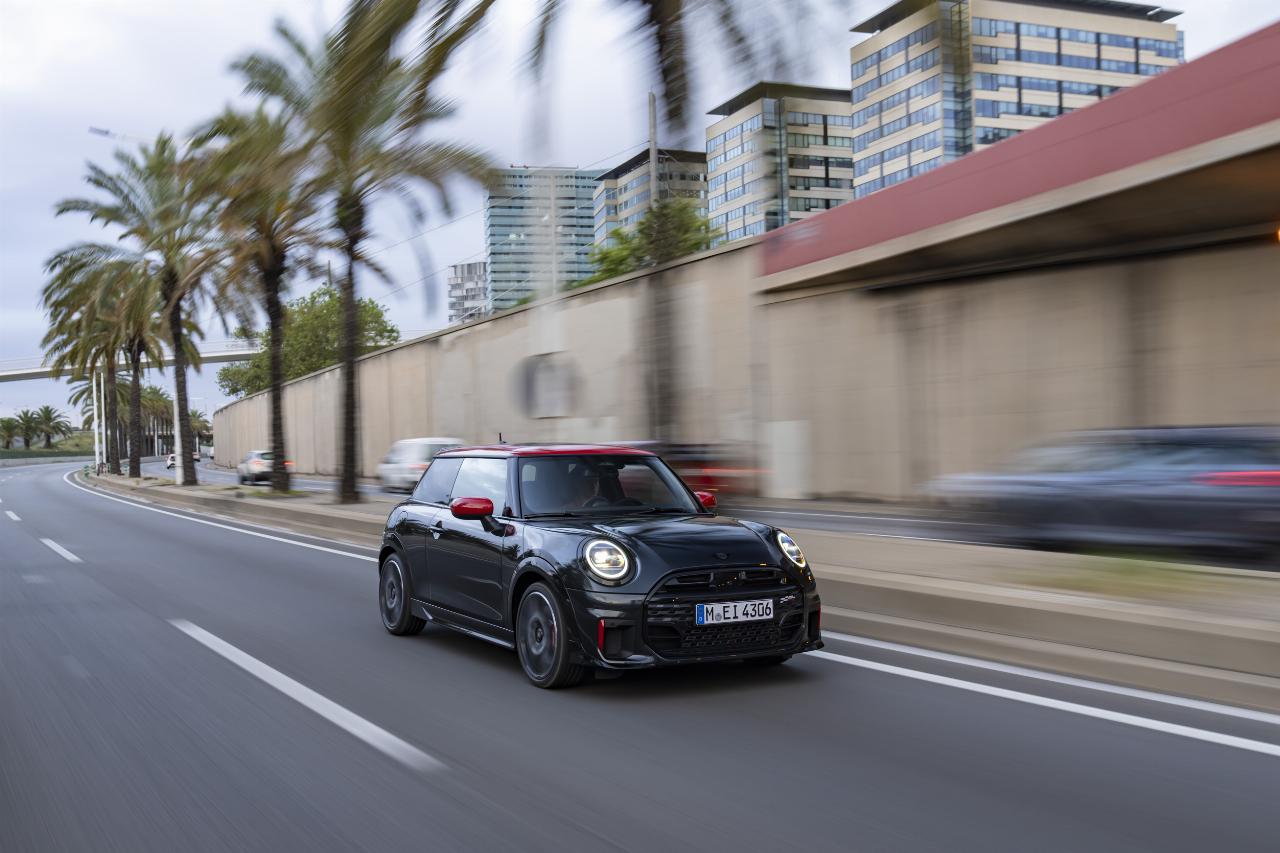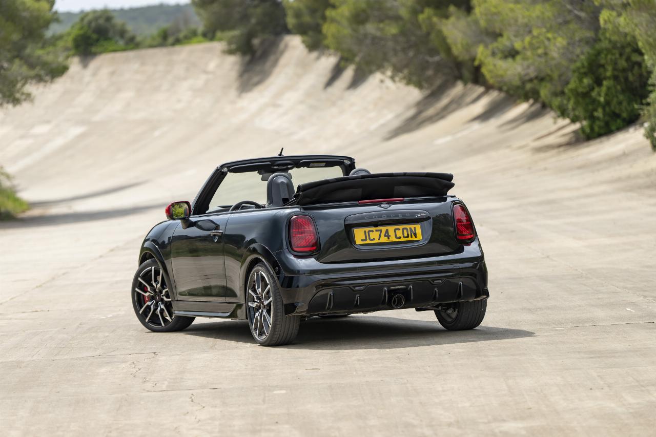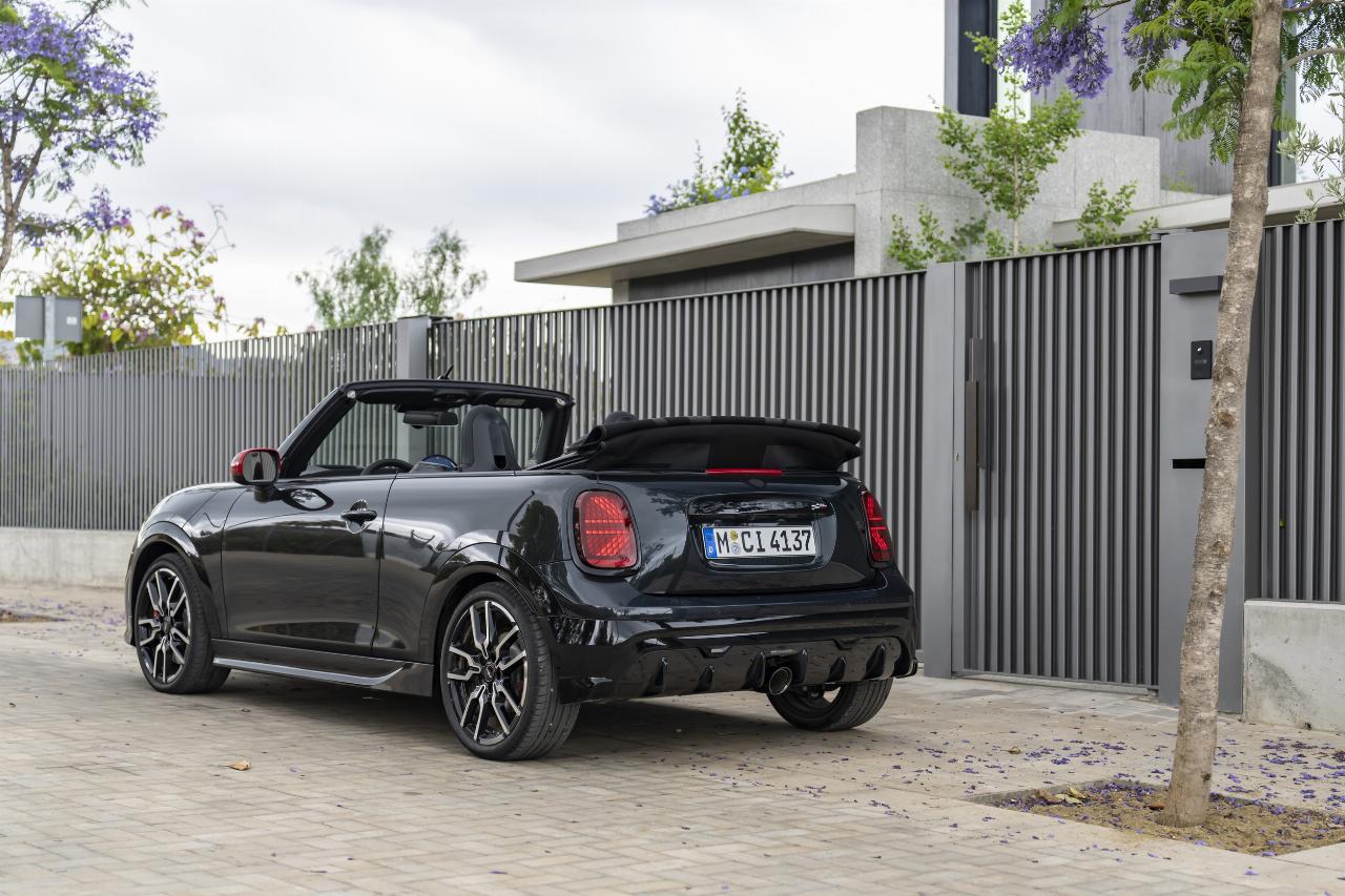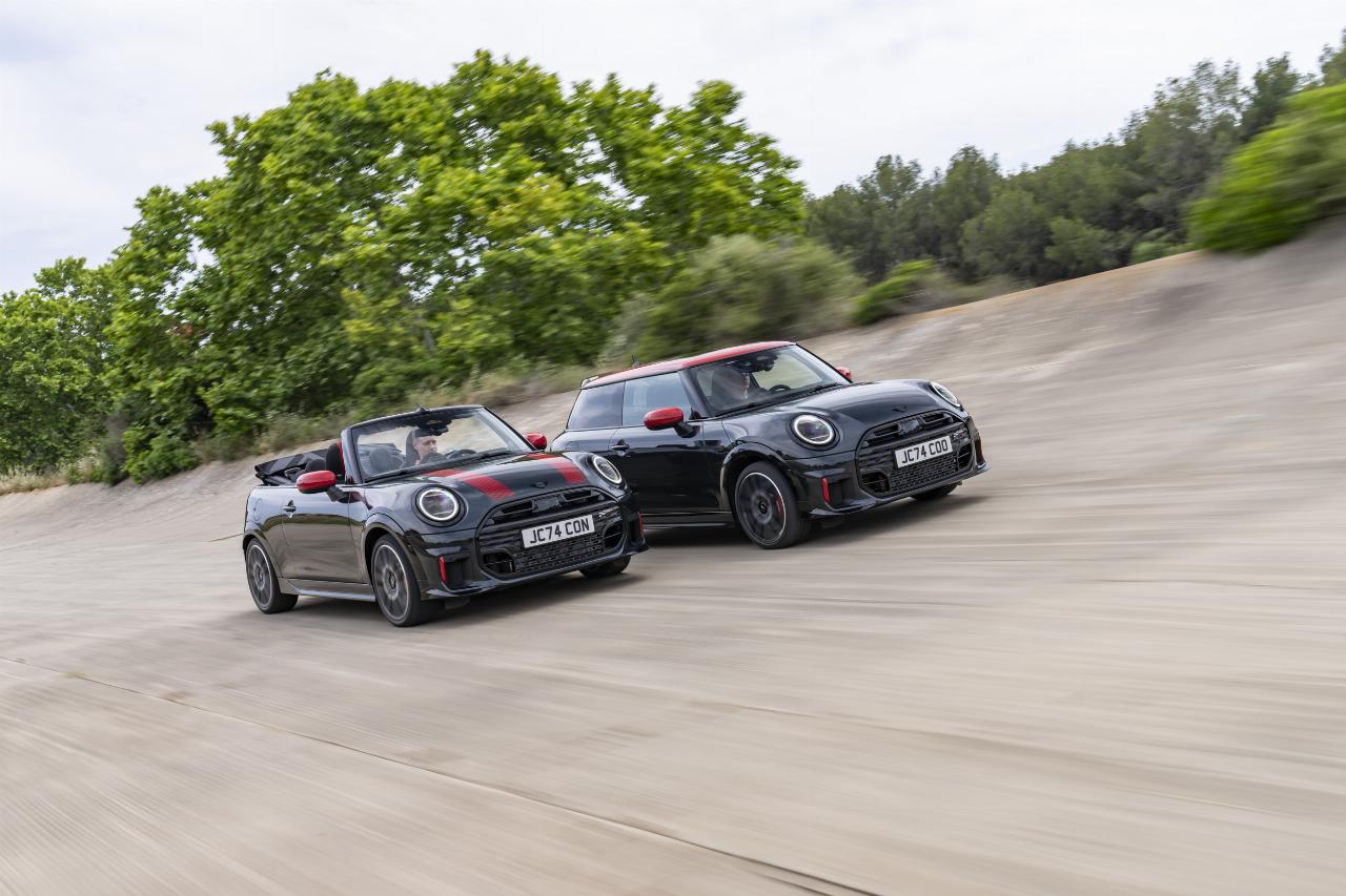 Die spezifische Frontschürze trägt sowohl zu höherer Luftzufuhr für die Motorkühlung als auch zu besserer Aerodynamik bei. Bestimmende Karosserie- und Interieurfarben sind Schwarz und Rot. Der JCW erreicht eine Spitzengeschwindigkeit von 250 km/h, das Cabrio kommt auf 245 km/h. Der Mini John Cooper Works kann wahlweise mit einem Kontrastdach und Spiegelkappen in den Farbtönen Chili Red und Jetblack akzentuiert werden. Das Cabrioverdeck ist in Schwarz oder mit einem in Grau abgesetzten Union-Jack-Muster verfügbar.