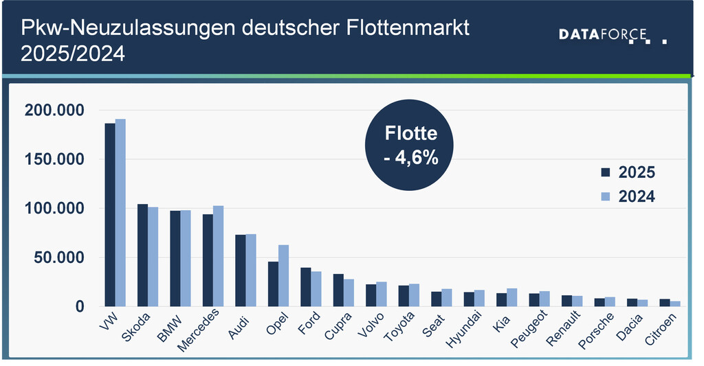Innerhalb des Marktes entwickelten sich die Hersteller sehr unterschiedlich. Einige Marken nutzten das Jahr, um im Flottengeschäft Boden gutzumachen. Ford etwa legte um 11,3 Prozent zu und landete auf Rang sieben, Cupra steigerte sein Volumen sogar um beachtliche 19,0 Prozent und erreichte Platz acht. Skoda schob sich mit einem Plus von 3,0 Prozent auf Rang zwei vor, direkt hinter Volkswagen. Zwar mussten die Wolfsburger ein leichtes Minus von 2,3 Prozent hinnehmen, erreichten laut Dataforce mit 21,5 Prozent aber den höchsten Flottenmarktanteil eines Gesamtjahres seit 2016. Dass der Skoda Octavia 2025 das erfolgreichste Flottenmodell war, dürfte angesichts dieser Bilanz zu verschmerzen sein.