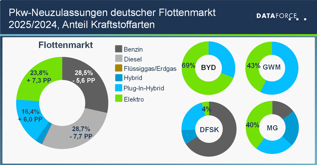 Unübersehbar ist dennoch die Richtung: Die Elektrifizierung der Fuhrparks nimmt Fahrt auf. Diesel und Benziner rutschten 2025 erstmals unter die 30-Prozent-Marke. Plug-in-Hybride steigerten ihren Anteil auf 16,4 Prozent, batterieelektrische Fahrzeuge kletterten auf knapp 24 Prozent. In den Monaten November und Dezember lagen reine Stromer bereits an der Spitze der Antriebsarten.