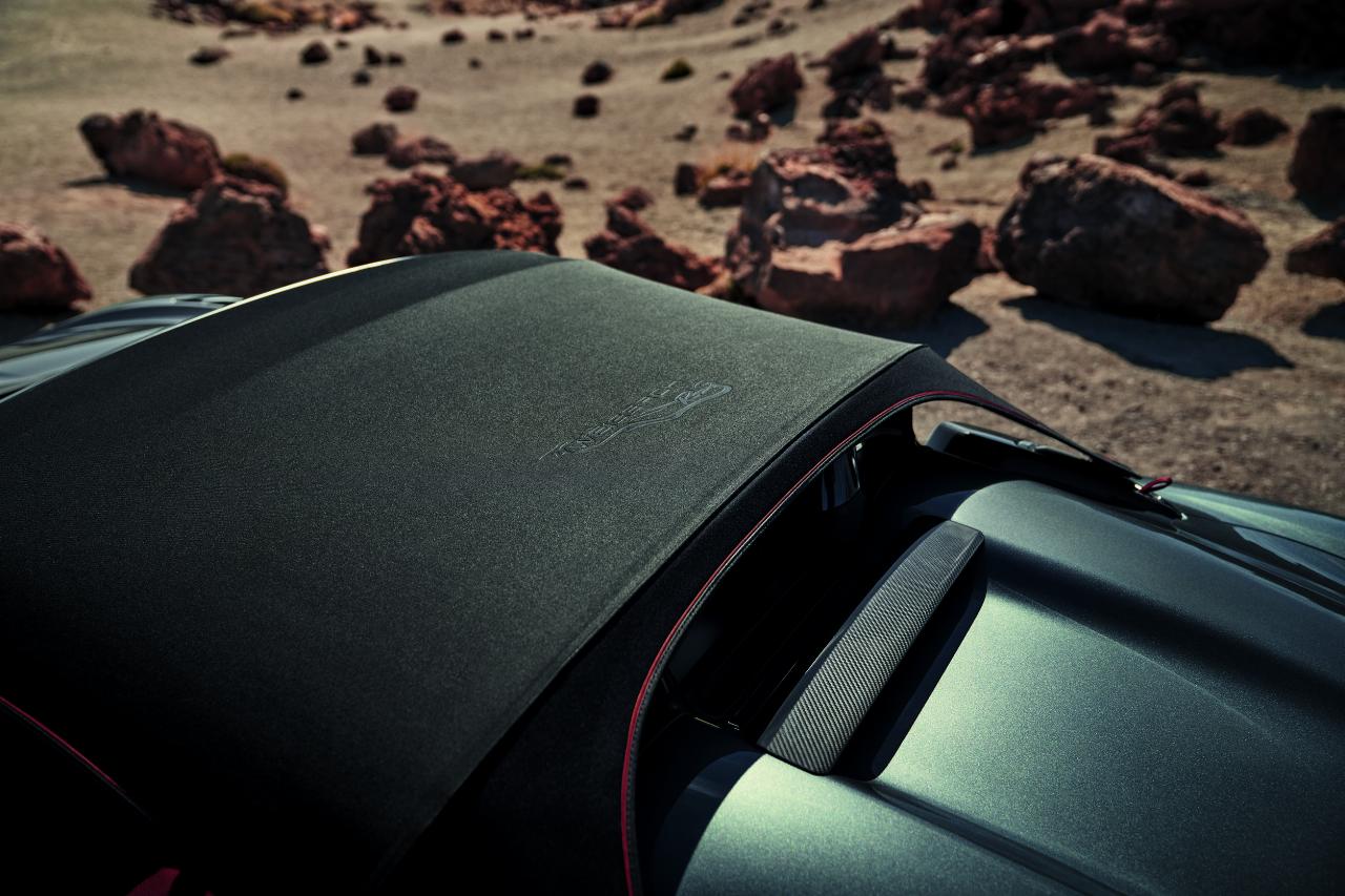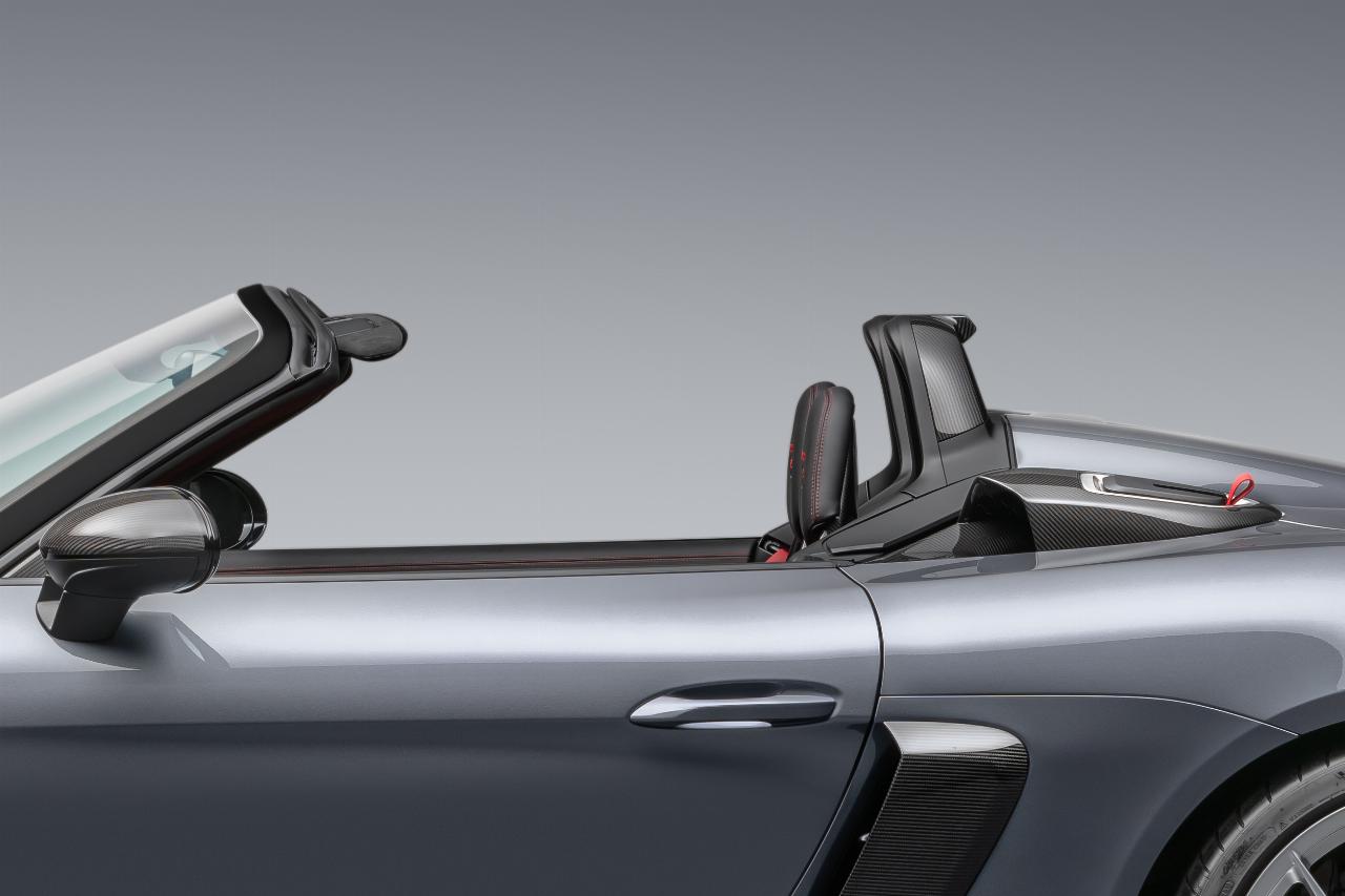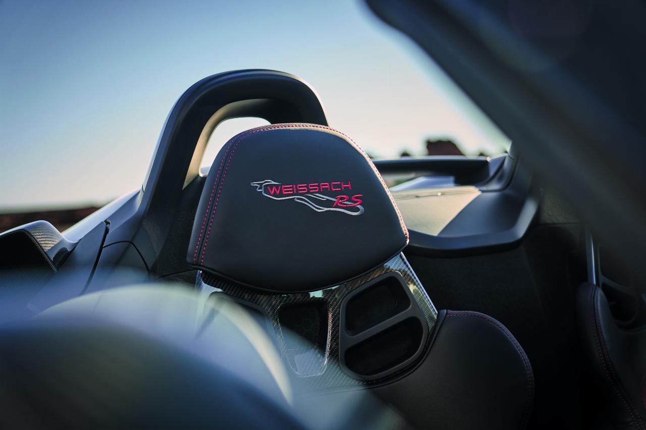 Der 718 Spyder RS ist mit 1410 Kilogramm 40 Kilogram leichter als der 718 Spyder und sogar fünf Kilogramm leichter als die geschlossene Version GT4 RS. Zahlreiche Leichtbauteile wie Sitzschalen und Fronthaube in CFK tragen zur Gewichtsersparnis bei. Details wie einfache Schlaufen zum Offenen der Türen oder eben das einlagige Verdeck tun ein Übriges. Es wiegt nur 18,3 Kilogramm, 16,5 Kilogramm weniger als das des 718 Boxster. Wer sich des Wetters sicher ist, lässt es einfach in der heimischen Garage und spart so weitere Kilos.