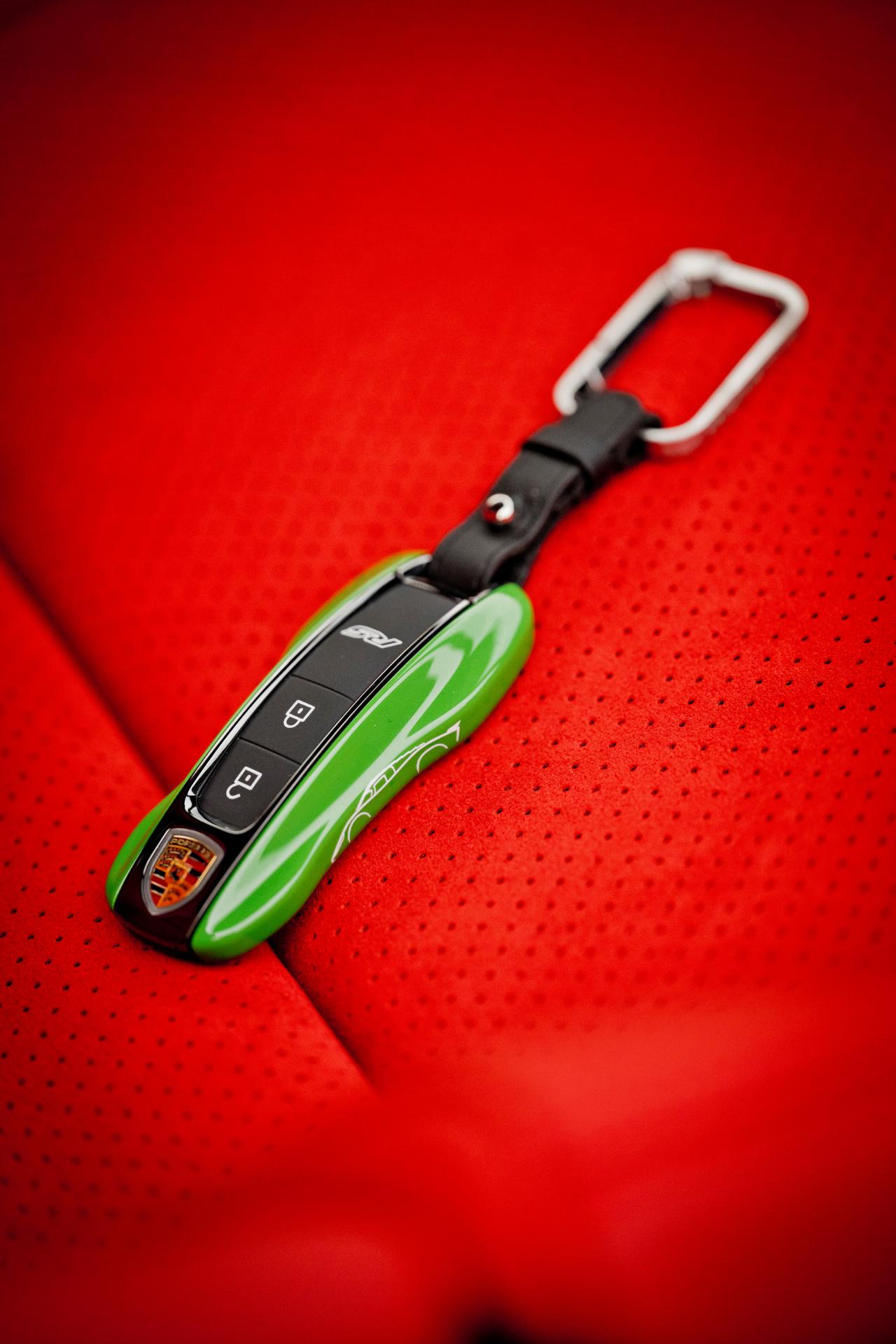 Im Innenraum dominiert Race-Text in Schwarz und Indischrot. In die Kopfstützen ist das Helm-Motiv gestickt. Die Türeinstiegsleisten zieren die 917er-Silhouette kombiniert mit der Unterschrift. Auch der Fahrzeugschlüssel wurde individualisiert: Die Seitenwangen sind in Purweiß beziehungsweise im heutigen Vipergrün lackiert, die Silhouette des 917 wurde in der jeweiligen Kontrastfarbe aufgedruckt. Auf den Deckel der Mittelkonsole und in das lederne Schlüsseletui ist die Unterschrift von Jo Siffert geprägt.