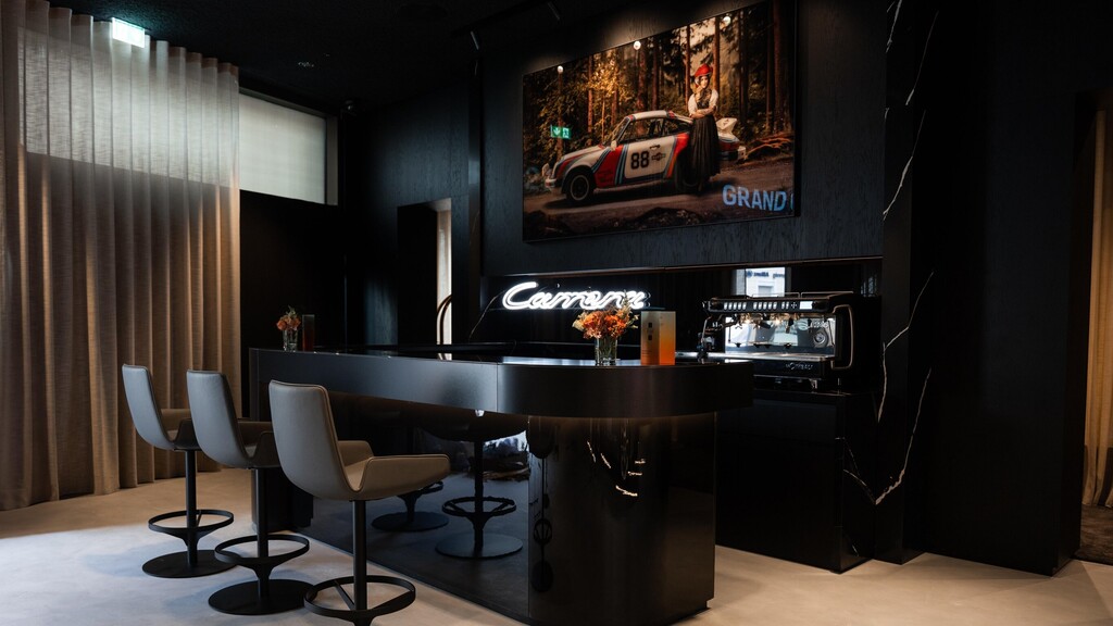 Das Studio Baden-Baden bietet Platz für mindestens zwei Fahrzeuge. Zur Eröffnungsfeier finden Besucher dort einen Taycan Turbo GT mit Weissach-Paket, der in der aufwendig gestalteten Lichtgarage inszeniert ist. Durch die flexible Gestaltung ist ein Fahrzeugtausch jederzeit möglich. Der Raum bietet Kunden und Interessenten die Gelegenheit, sich in Ruhe umzuschauen und beraten zu lassen. Die Lounge-Ecke und Kaffee-Bar laden zum Verweilen ein. Zusätzlich werden ausgewählte Produkte von Design angeboten. Außerdem wird ein Porsche-E-Bike präsentiert.