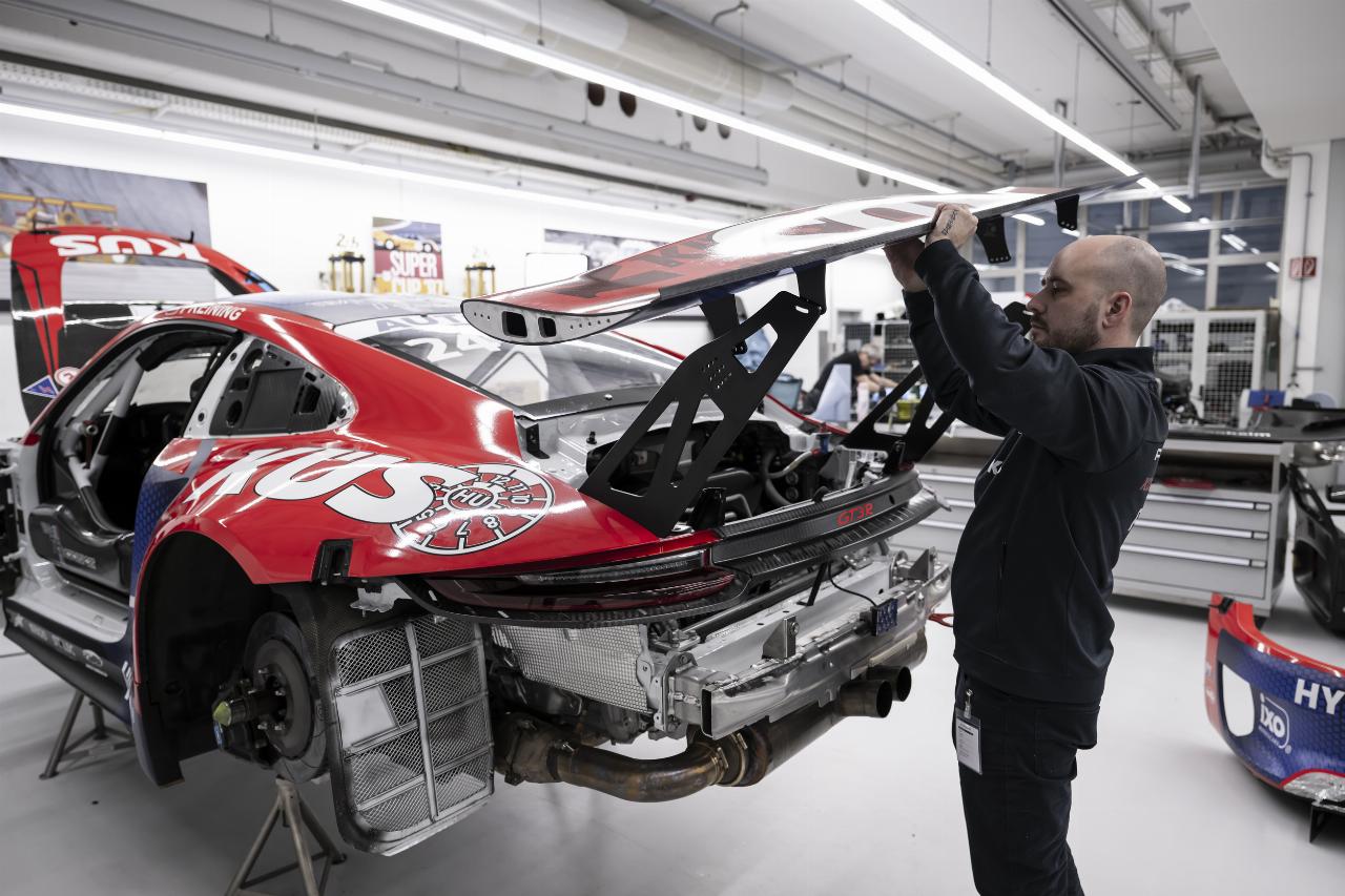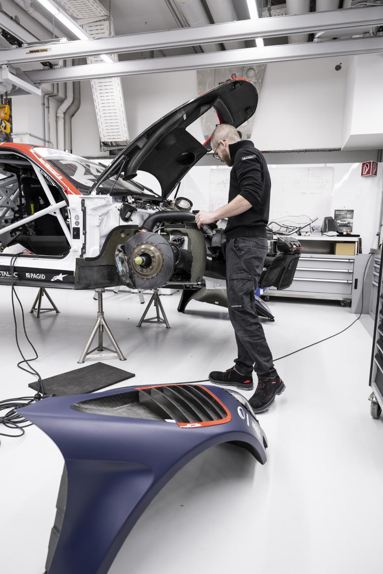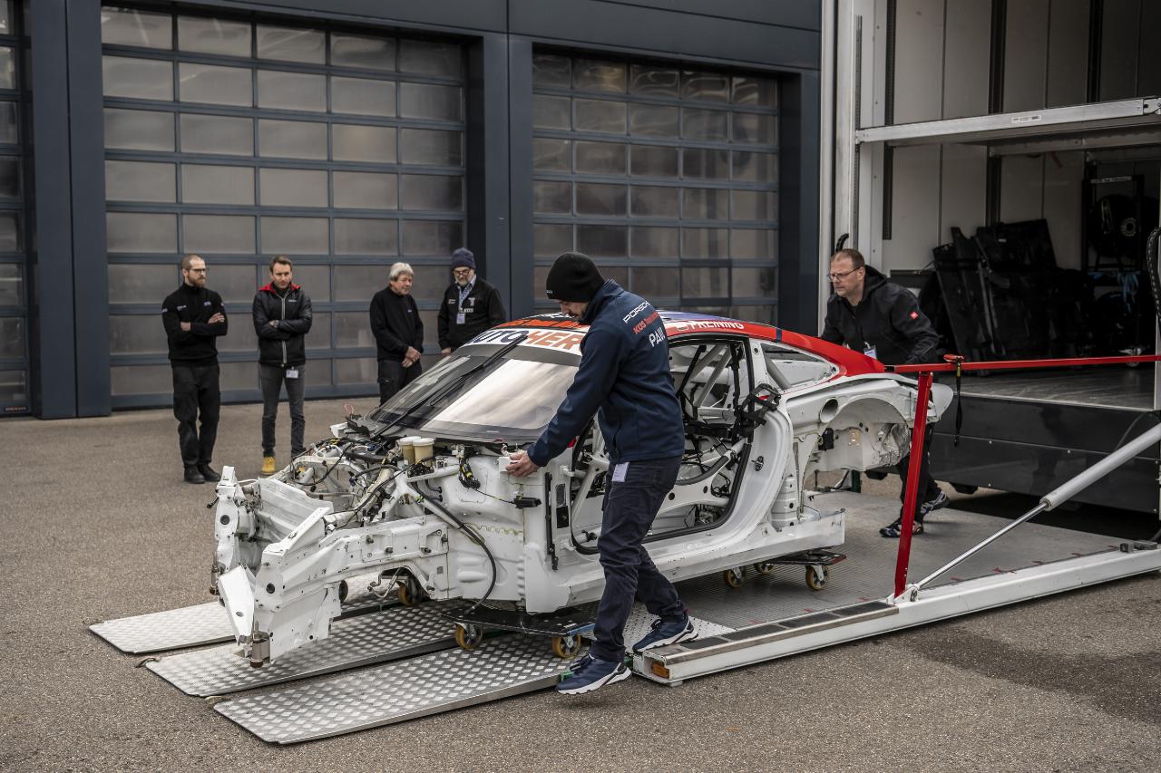 Mit den Innenräumen der beiden nebeneinander stehenden Rohkarossen startete das Instandsetzungsprojekt. Kabelstrang, Steuergeräte, Feuerlöschanlage und Pedalerie wurden eins zu eins vom verunfallten Fahrzeug in das neue Chassis eingebaut, ebenso das Armaturenbrett. Als nächstes folgen Klimaanlage, Fahrwerks- und Karosserieteile sowie die Verrohrung. Ganz zum Schluss montieren die Spezialisten Motor und Getriebe des Rennautos.