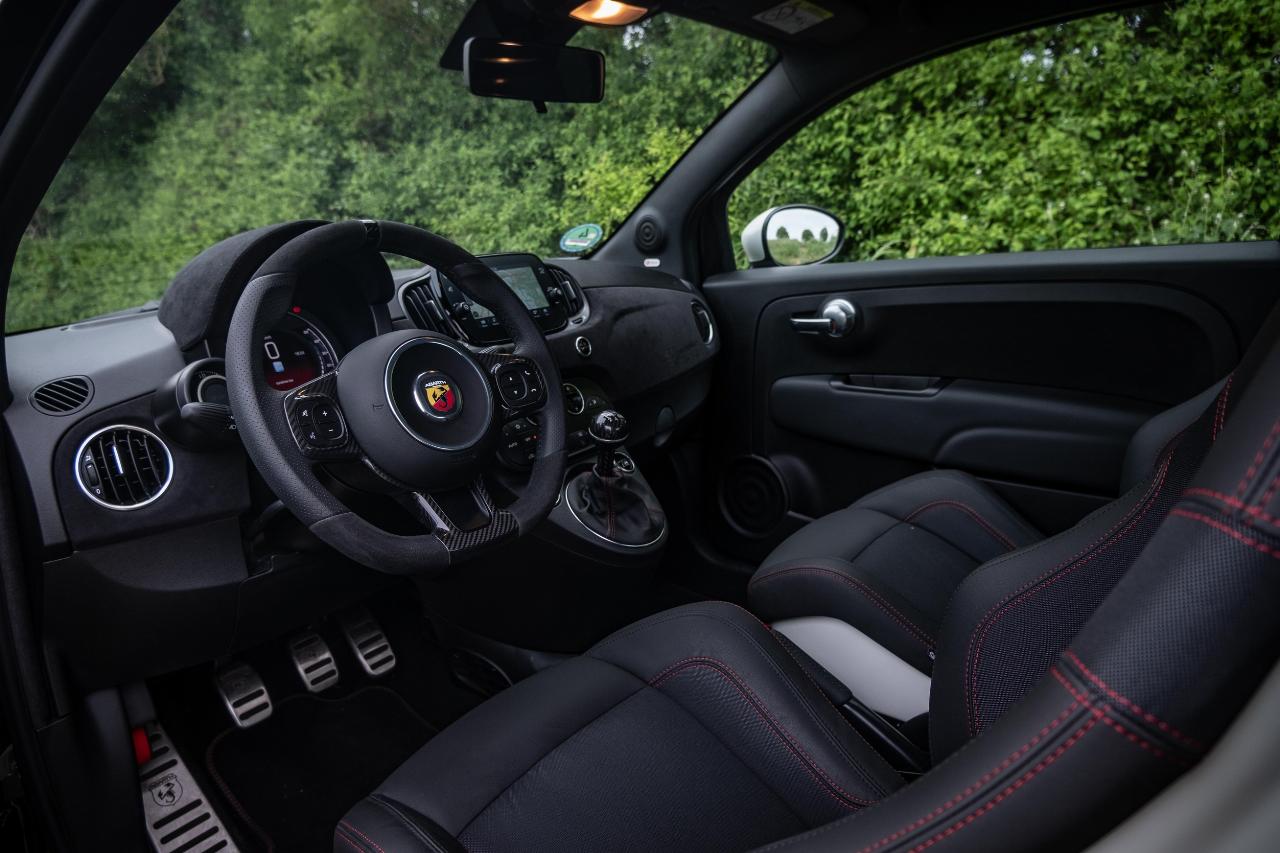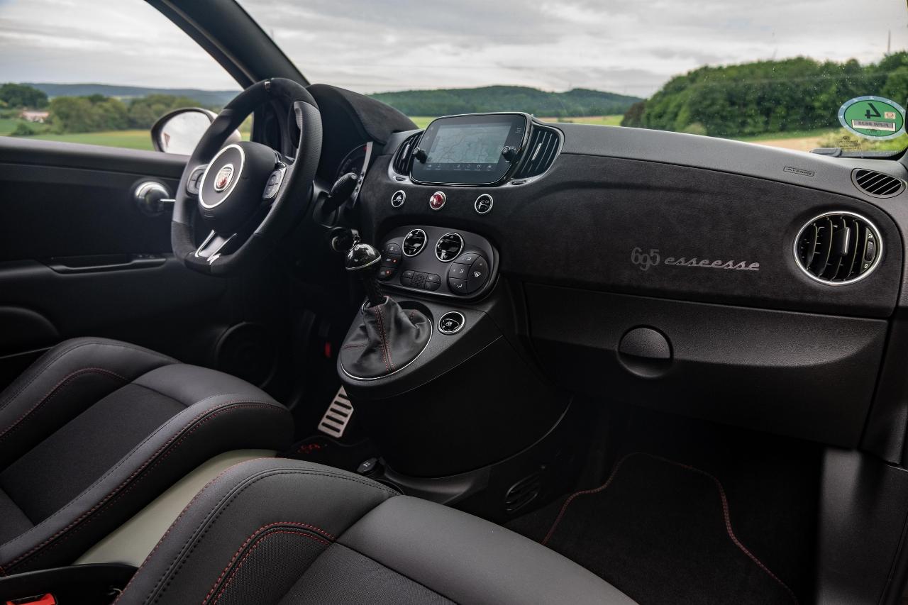 Passend zur Rennstrecken-Emotion zurren sich Fahrer und Passagiere mit roten Sicherheitsgurten im Abarth fest, um abermals an die Identität des kleinen Renners erinnert zu werden: Auf dem Armaturenbrett ist feinstes Alcantara verarbeitet worden, das mit eingelassenem „695 Esseesse“-Schriftzug gezielt Noblesse versprüht. Da schaut man sich die runden Chromrahmen der Schalter unter dem Infotainmentsystem umso lieber an. Darunter blitzt dann der Echtcarbon-Schaltknauf nebst Lenkrad mit Alcantara, perforiertem Leder und ebenfalls Echtcarbon-Elementen hervor. Mit diesen Details läuft der kunststofflastige Innenraum zur Hochform auf.