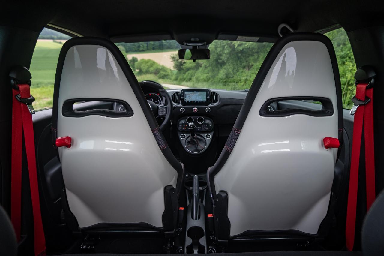 In den Sabelt-Schalen mit roten Ziernähten und Schriftzug „One of 695“ fühlen sich Hardliner wohl, die nicht genug von der direkten Verbindung zwischen Fahrwerk und Popometer bekommen können. Wer mit dem Abarth häufiger nach bella Italia herunter düsen will, sollte eine Ausstattungsvariante mit normalen Ledersitzen wählen. Beim Restkomfort liegt der 695 Esseesse gleichauf mit dem 595 Competizione, dessen Technik er übernimmt. Es handelt sich also um ein reines Auto für Fans, die an sonnigen Tagen ihren 500 in voller Montur genießen wollen. Wünsche jedenfalls lässt die Ausstattungsvariante nicht offen. Bei dem saftigen Kaufpreis knapp 34.000 Euro darf der 695 Esseesse das auch nicht, denn die Grenze des guten Geschmacks ist für ein Auto in dieser Fahrzeugklasse im Grunde längst gesprengt.