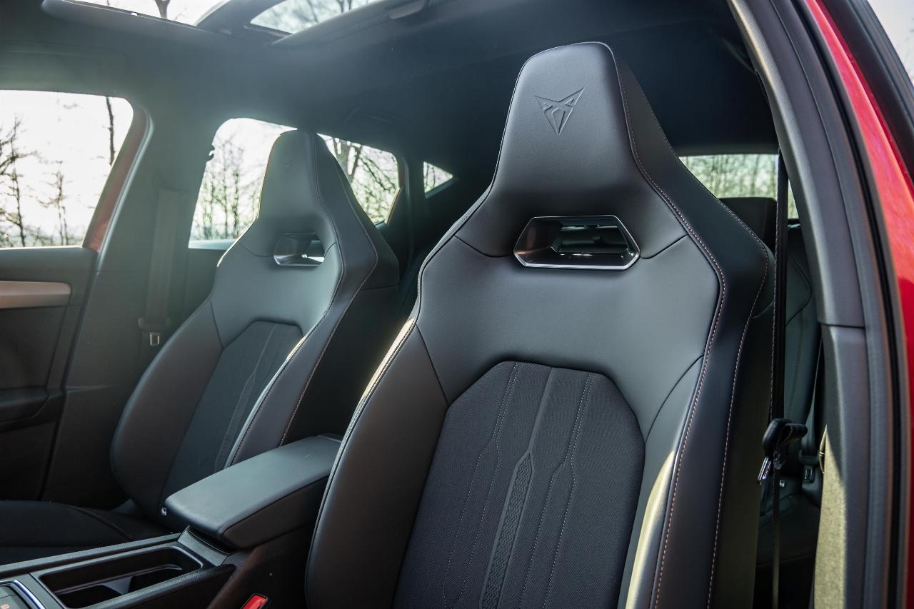 Für solche modernen Besonderheiten entschädigen traditionelle Werte auf der anderen Seite: Die Verarbeitung macht einen guten Eindruck, und die Sportsitze überzeugen auf ganzer Linie. Bequem genug für eine Fahrt von Hamburg nach Frankfurt, aber trotzdem fest im Sattel: So geht ein Sportsitz in der Kompaktklasse. Auch bei der Verarbeitung leistet Cupra ganze Arbeit und kann mit robustem abgestepptem Stoff und sauber verarbeiteten Ziernähten punkten. Das Leder der geteilten Materialkombination macht einen hochwertigen Eindruck.