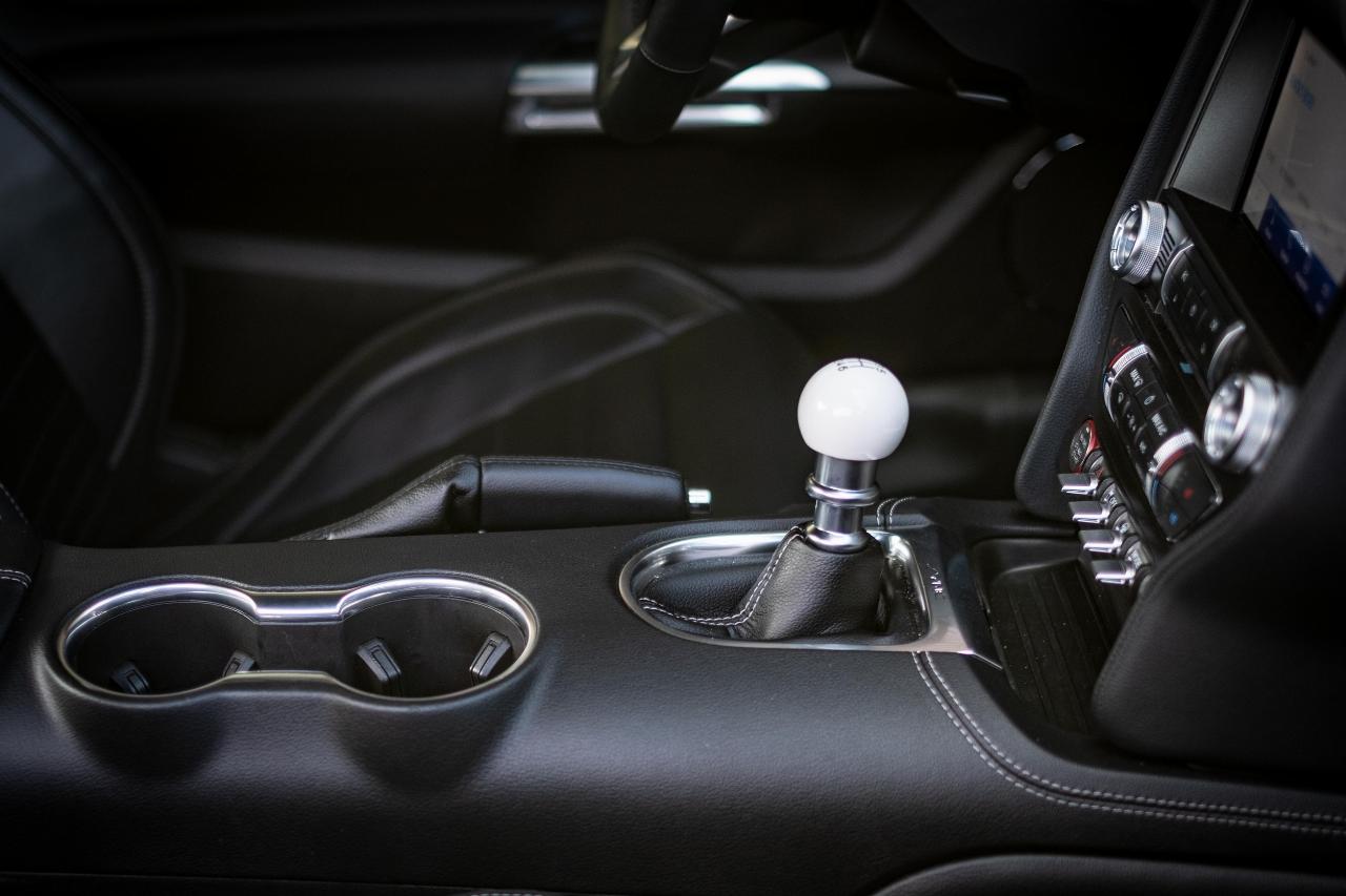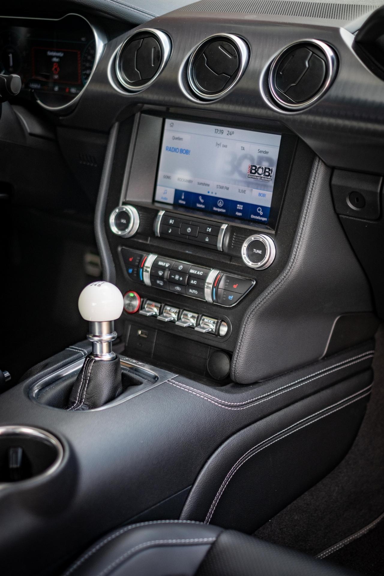 Für den Innenraum muss man als Europäer am besten die Brille abnehmen. Im Großen und Ganzen macht die Fahrgastzelle zwar einen coolen bis sportlichen Eindruck und greift typische Mustang-Erkennungsmerkmale, wie etwa den Schaltknauf im weißen Billiardkugel-Look oder die Mach-1-Plakette über dem Handschuhfach, auf. Die Ausführung ist jedoch teils ohne Millimetermaß vorgenommen worden, so dass man besonders bei der Umrahmung besagter Plakette – aber auch an anderen Stellen – lieber wegschaut.