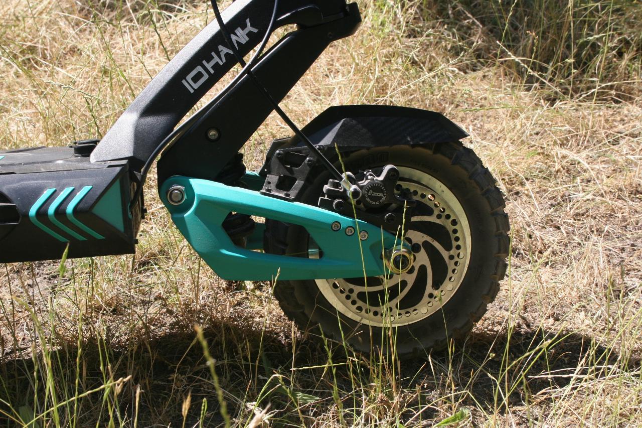 Wegen seiner Auslegung als „Offroader“ bringt der IO Hawk zwei Federbeine und eine Vorderradschwinge mit. Die Technik hat gleich in doppelter Hinsicht ihren Preis: Der Legacy kostet offiziell 2099 Euro (derzeit rabattiert 300 Euro weniger) und wiegt stolze 34 Kilogramm. Das ist weit mehr als ein Pedelec, spricht aber für die Robustheit der Konstruktion. Und die kann überzeugen, hat allerdings auch einen Nachteil: Wenn der elektrische Kickscooter wegen leerer Batterie tatsächlich einmal als reiner Tretroller benutzt werden muss, ist das Vorwärtskommen etwas beschwerlicher. Doch mit einer angegebenen Reichweite von bis zu 120 Kilometern ist die Gefahr des Liegenbleibens relativ gering.