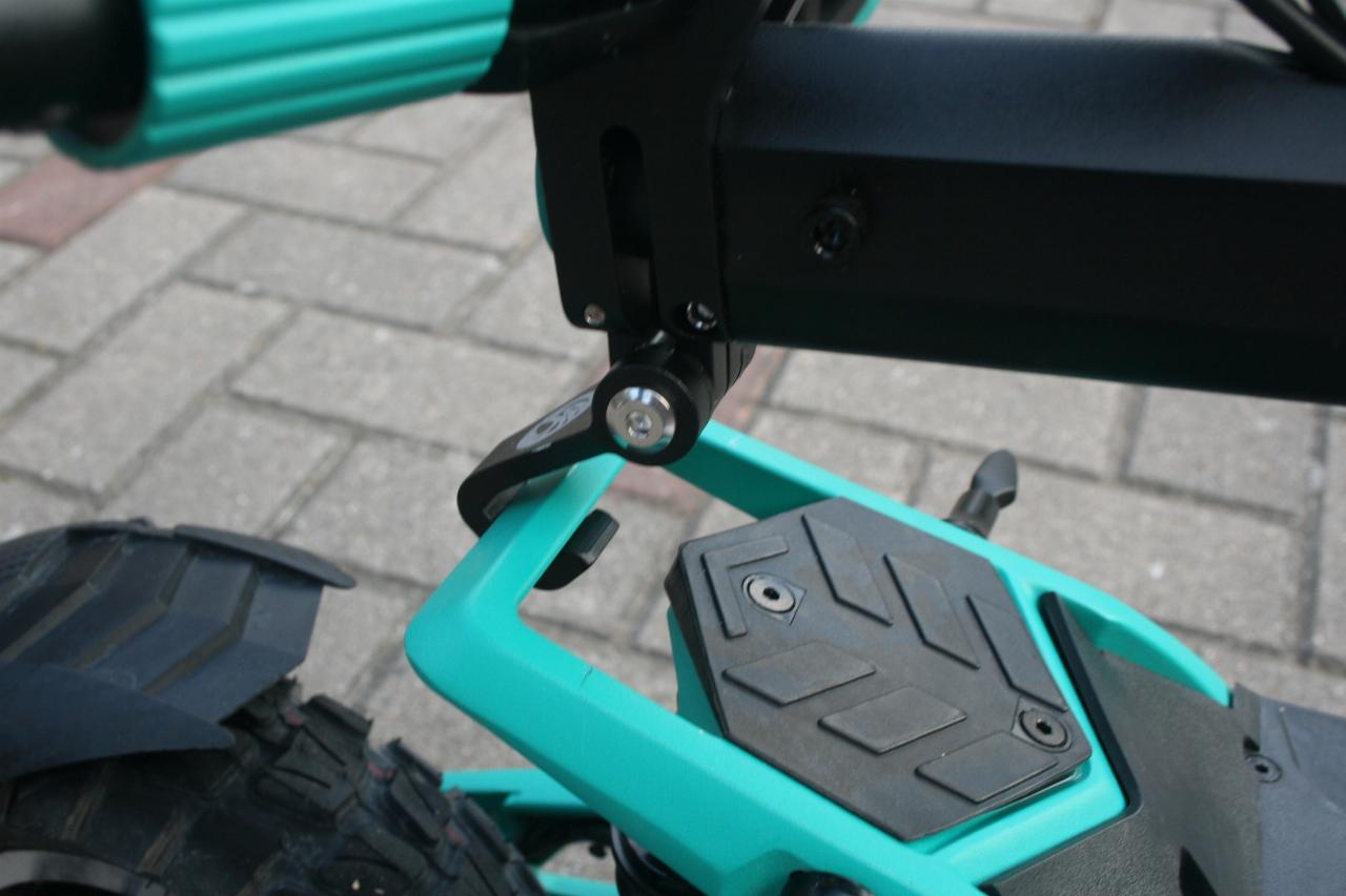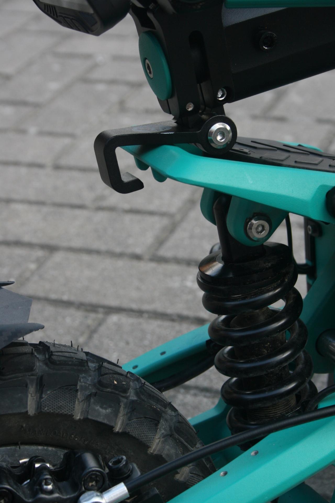 Etwas umständlich, aber dafür gut gesichert ist der Klappmechanismus, wenn der Scooter verstaut oder getragen werden soll. Der Spanner ist zusätzlich mit einer Schraube an der Lenkstange gesichert, die erst losgedreht werden muss. Vor allem beim Wiederzusammenbau wird es etwas fummelig, da es nicht immer auf Anhieb gelingt, die Gewindebohrung zu treffen. Nicht ganz überzeugen kann die anschließende Arretierung der liegenden Lenkstange zur Verwendung als Tragegriff. Hier dient der Taschenhaken als Klammer, bietet aber zu viel Spiel. Wird der Scooter angehoben, steht er unter Spannung, wird er aber wieder losgelassen, kann sich der Haken lösen und greift beim nächsten Anheben nicht mehr automatisch.