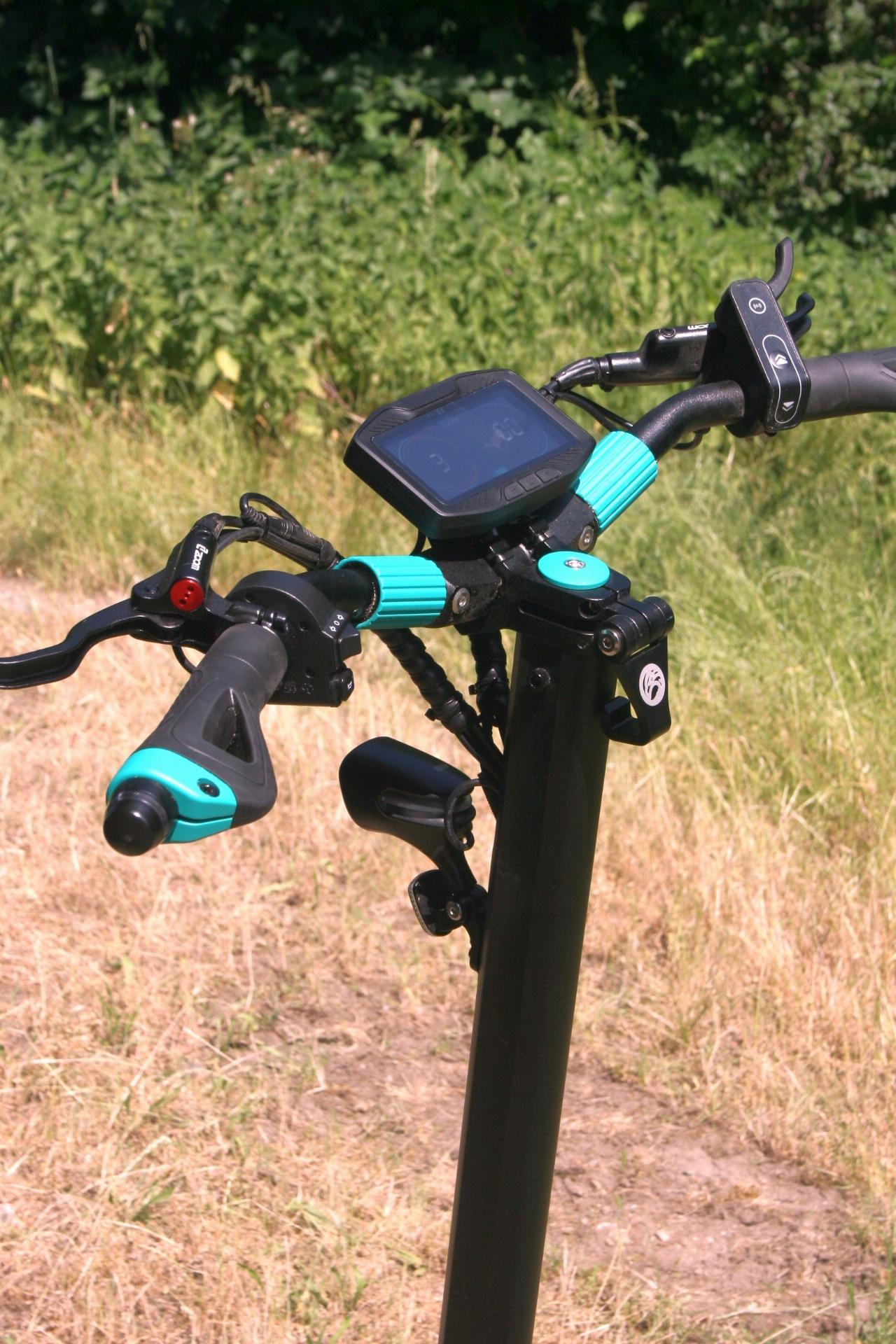Statt eines Drückers für den Daumen verfügt der Legacy über einen mit dem Finger zu ziehenden Beschleunigungshebel. Das macht vor allem auf unbefestigten Wegen Sinn, da der Fahrer den E-Scooter so auf holperigen Strecken besser im Griff hat und im Gelände nicht so leicht abrutscht wie mit dem Daumen. Der Offroader unter den E-Rollern bietet drei Fahrstufen, die die Geschwindigkeit auf zehn, 15 und 20 km/h (Display: 23 km/h) begrenzen. Das da noch viel mehr ginge, legt der lange tote Weg nahe, den der „Gasgriff“ noch bis zum Anschlag zurücklegen kann.