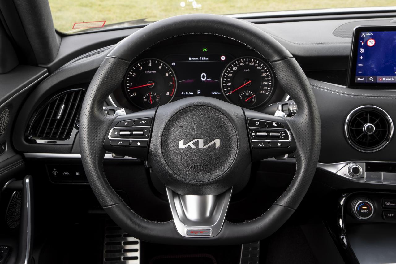 Das war es aber auch schon in Sachen Kritik. Der 10,25 Zoll große Touchscreen erweist sich als intuitiv bedienbar und das Multimediasystem gefällt mit einer schnellen Routenberechnung. Darüber hinaus fällt das Angebot an Fahrerassistenten umfangreich aus. Angefangen beim Totwinkelwarner, der beim Blinkersetzen die Kamerabilder des rückwärtigen Verkehrs in das Instrumentendisplay einblendet, über den adaptiven Tempomaten bis hin zum Kollisionswarner ist alles serienmäßig an Bord. Da außerdem die Verarbeitungsqualität mit ansprechenden Materialien im Innern hochwertig ausfällt, kann der kostengünstige Stinger durchaus mit seiner Premium-Konkurrenz locker mithalten und gilt als ein ebenbürtiger Geheimtipp. (Guido Bock, cen)
