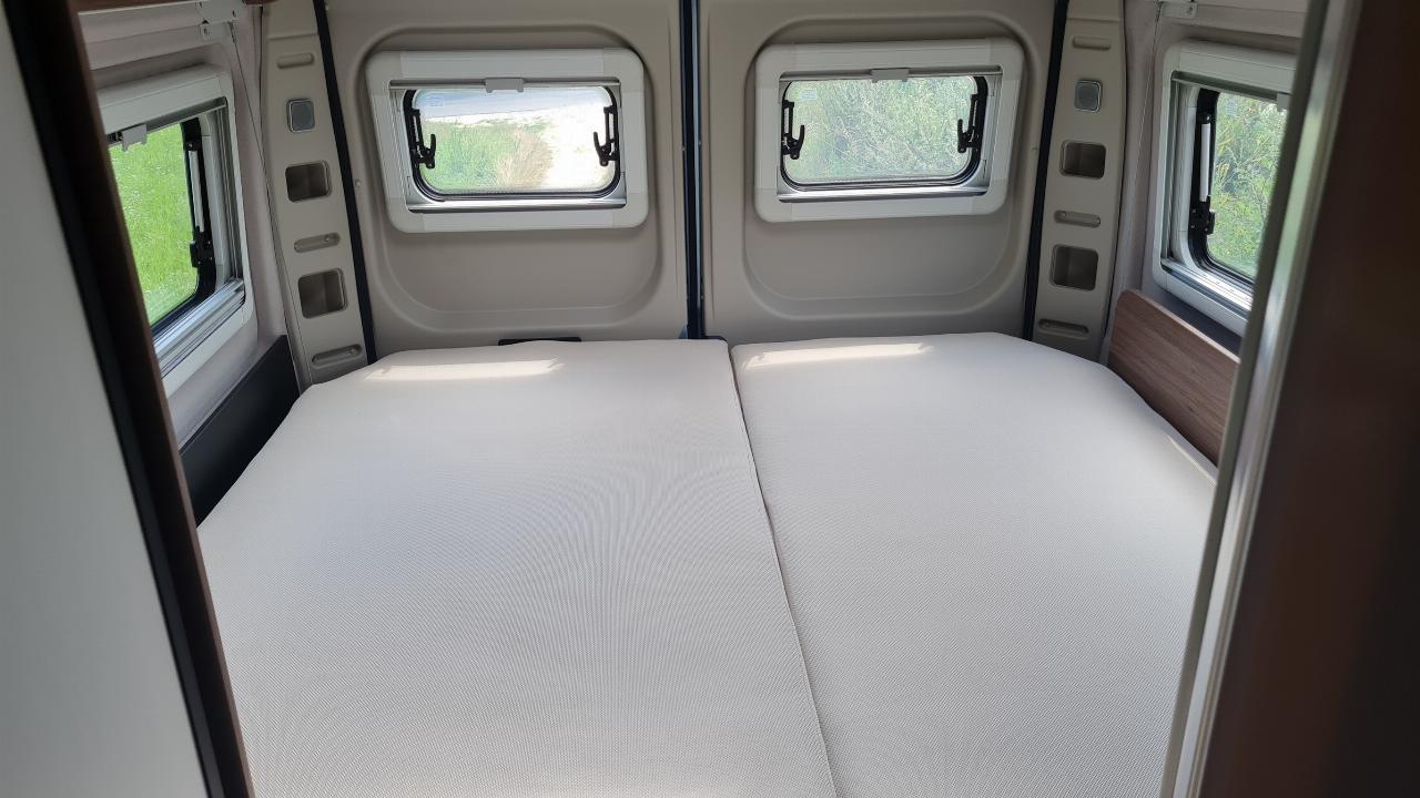Die erneuerte Boxlife-Serie von Knaus wendet sich vor allem an sportliche Camper, die den Komfort des variablen Schlafzimmers mit der Transportmöglichkeit für Wake-Board, Bike oder Bergsteigerequipment kombinieren wollen. Der Grundgedanke im 630 ME, der den Fiat Ducato als Basis nutzt, ist einfach. Oberhalb der beiden längs eingebauten Einzelbetten im Heck (zusammen 195 mal 185 Zentimeter groß) lagert eine weitere, 202 mal 188 Zentimeter große Liegefläche. Sie hängt an vier Drahtseilen und relativ gut geführt in vier seitlichen Metallschienen. Ein Tastendruck entsperrt die Verriegelung und mit vergleichsweise geringer Muskelkraft lässt sich das Doppelbett bis weit nach oben unter die Decke fahren.