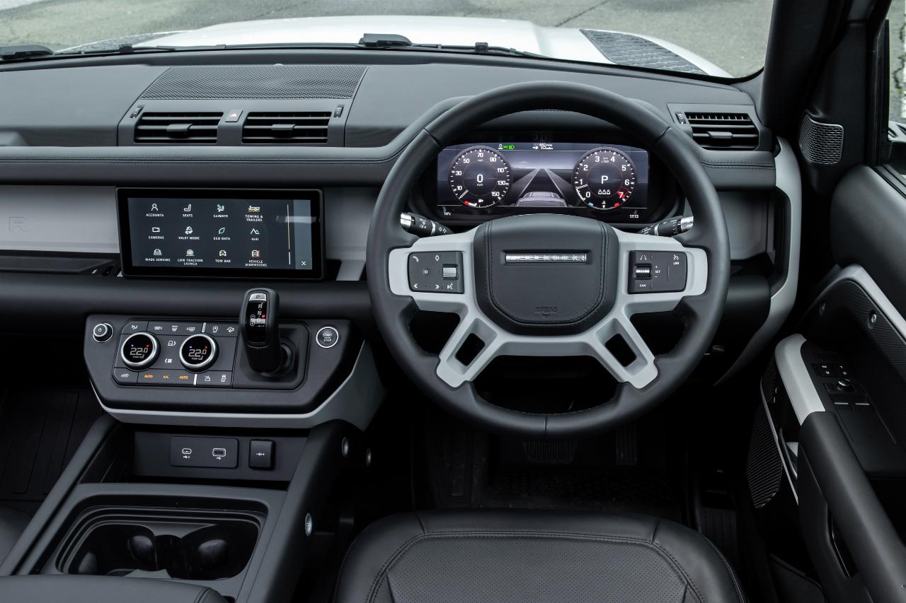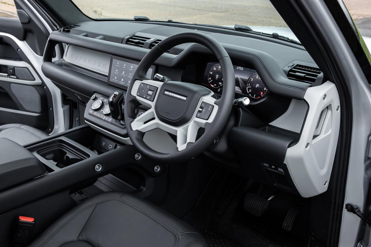 Rund ums Cockpit gibt der Defender keine Rätsel auf, da es glücklicherweise noch genügend klassische Schalter und Drehregler gibt. Doch wirkt so manche Handhabung überfrachtet und unnötig kompliziert, da die Offroad-Programme im Menü des Touchscreens versteckt sind. Gleiches gilt für die Aktivierung der mittleren und hinteren Differenzialsperren. Ein direkter Zugriff über konventionelle Taster wäre die bessere Lösung gewesen, auch wenn der Land Rover im Alltag wahrscheinlich nicht ständig im Gelände unterwegs ist.