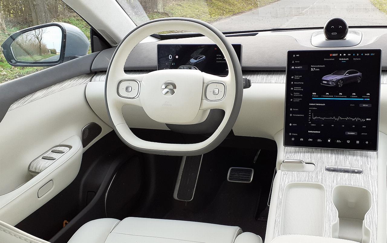 Kraft für den Allradantrieb ist im Überfluss vorhanden. 70 oder 100 Kilowattstunden (kWh) Akku-Kapazität (gemietet oder gekauft), 480 kW Leistung, 850 Newtonmeter Drehmoment, in 3,8 Sekunden aus dem Stand auf 100 km/h. Bis unters (serienmäßige) Glasdach ist der Nio angefüllt mit Digital-High-Tech, darunter 32 Kameras, zwölf Ultraschall-Sensoren und ein LiDAR-System, das über mehr als 600 Meter andere Fahrzeuge erkennen kann. Sender und Empfänger des Laser-Detektors sitzen mittig oberhalb der Frontscheibe im Dach und machen so den ET7 unverwechselbar. Dass im Hintergrund je Sekunde Daten in einer Menge verarbeitet werden, wie sie etwa 1,5 Stunden HD-Video entspricht, merken die Nutzer im Normalfall nicht.