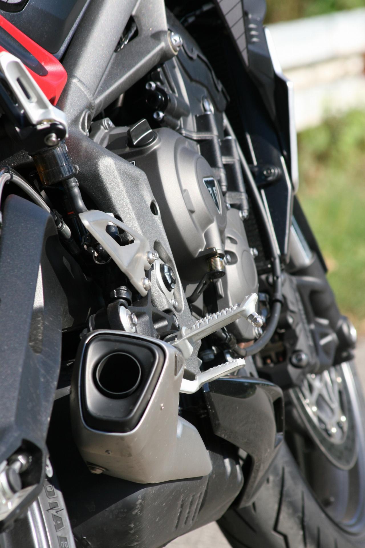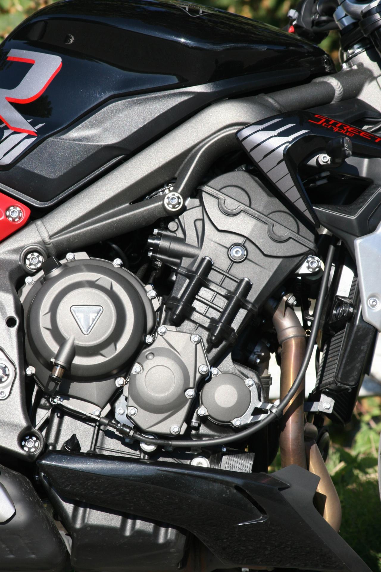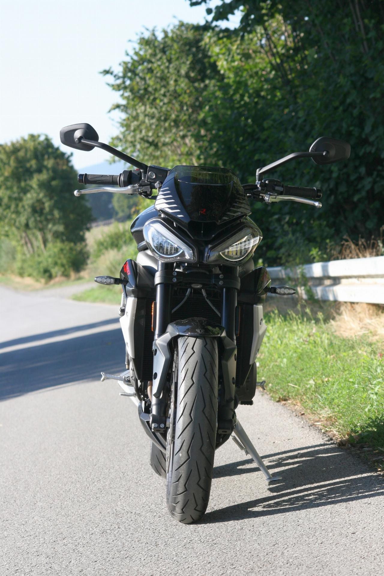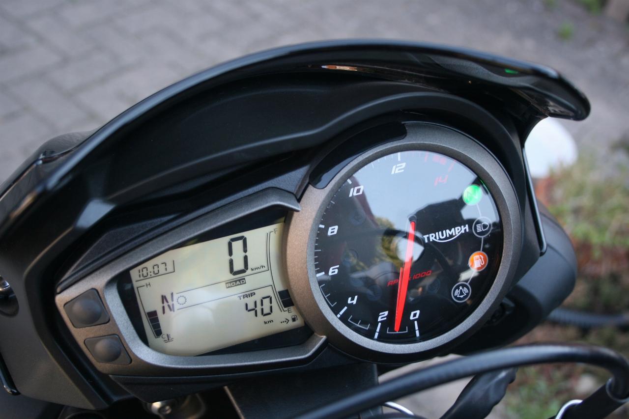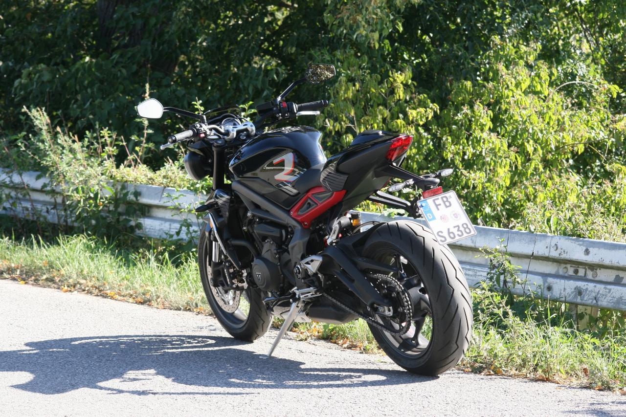 Nach wie vor setzen das agressive Insektenblick der Doppelscheinwerfer und der Dreizylinder-Motor ein Statement. So gefährlich wie sie dreinblickt fährt sich die Britin zum Glück nicht. Im Gegenteil: Es ist erstaunlich, wie gut beherrschbar sich die Maschine im unteren Drehzahlbereich gibt. Bis 6000 Touren läuft der Motor relativ weich. Erst in der zweiten Hälfte des Drehzahlbandes wird die Mechanik etwas spürbarer. Bei 7000 Umdrehungen pfeffert der Triple dann noch einmal nach, schließlich liegt die Maximalleistung erst bei 12.000 Umdrehungen in der Minute an. Doch die braucht es im Alltag und auch auf der Autobahn grundsätzlich eigentlich nie. Der Motor hat auch im unteren und mittleren Bereich stets genug Dampf auf den drei Kesseln. Wer sich nicht zur Wilden Reiter GmbH zählt, der benötigt selten über 8000 Touren. Dann zeigt der Tacho im letzten Gang knapp 160 km/h an.