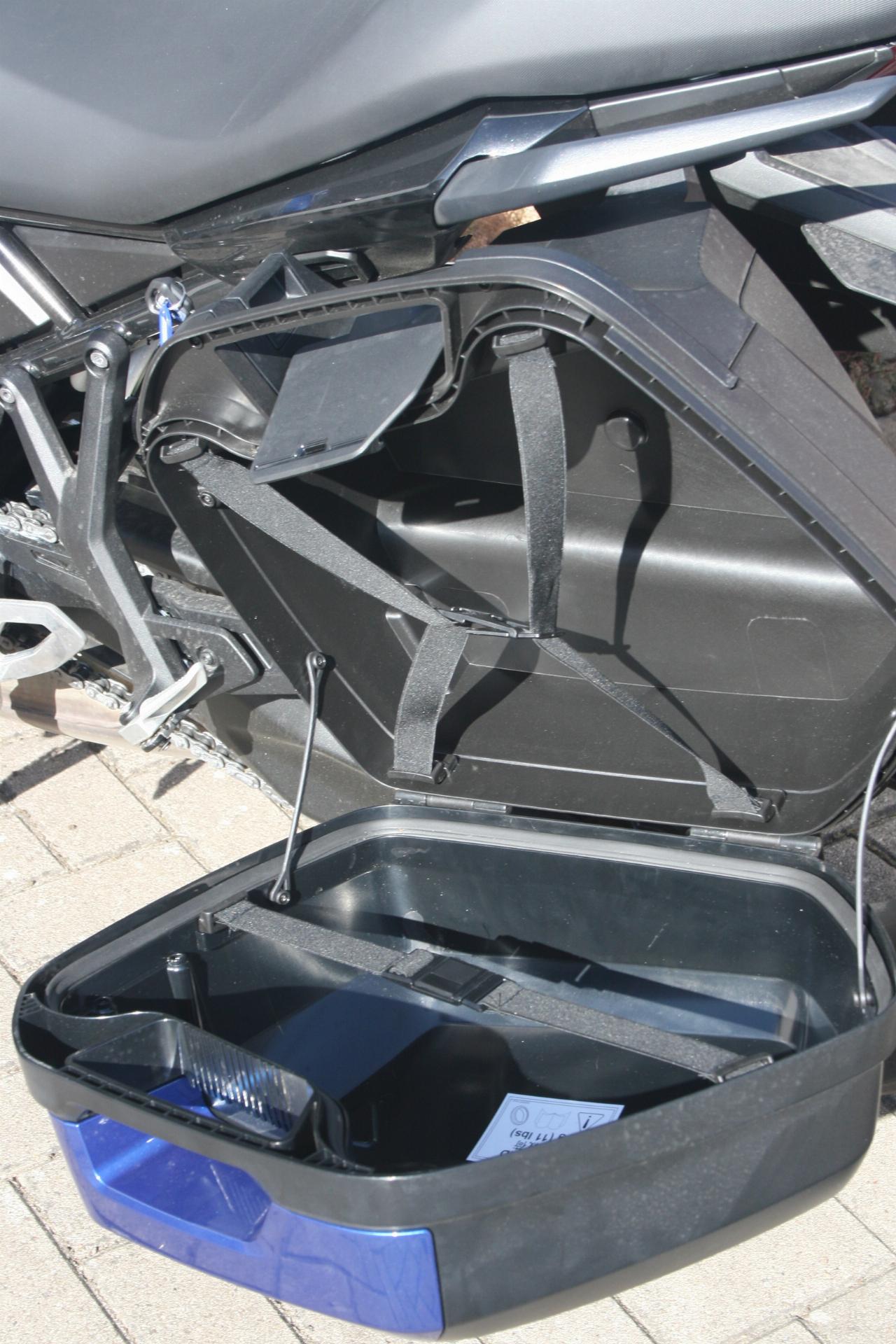 Der große Sammlertopf mit dem kurzen Endrohr steht einem Mittelständer im wahrsten Sinne des Wortes im Wege. Das ist für einen Tourer ein kleines Manko, aber weder eine Ausnahme noch ein ernsthaftes Ausschlusskriterium. Die im Zubehör erhältlichen Seitenkoffer mit einer erlaubten Zuladung von je fünf Kilogramm bieten im Deckel mehr Platz als auf der fest montierten Seite. Umgekehrt wäre es sicher besser, aber hier wie dort gibt es immerhin Spanngurte. Das Gesamtvolumen beträgt 57 Liter, obendrauf gibt es ergänzend natürlich auch noch ein Topcase. Angenehm ist dabei das Ein-Schlüssel-System. Zudem lässt sich der Schlüssel am Koffer nur abziehen, wenn dieser auch tatsächlich verschlossen ist. Der Kennzeichenträger verfügt über zwei kleine Schmutzabweiser oberhalb der Blinker.