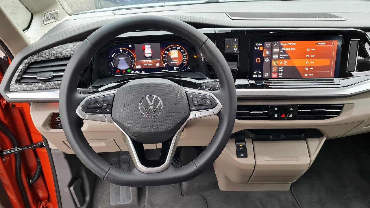Die erste Überraschung erlebt der Chauffeur, wenn er den schlank, aber komfortabel geschnittenen Fahrersitz erklimmt. Obwohl seine Position am kleinen Volant deutlich niedriger siedelt als im T6.1, ist es eine Frage der Technik, anständig einzusteigen. Denn der Türschweller ist arg in die Breite gegangen und da bedarf es entweder eines großen Schrittes, um ihn am Stück zu überwinden, oder es gilt auf halbem Wege Rast zu machen und die Einstiegstufe zu nutzen. Früher fiel es leichter, an Bord zu gehen.