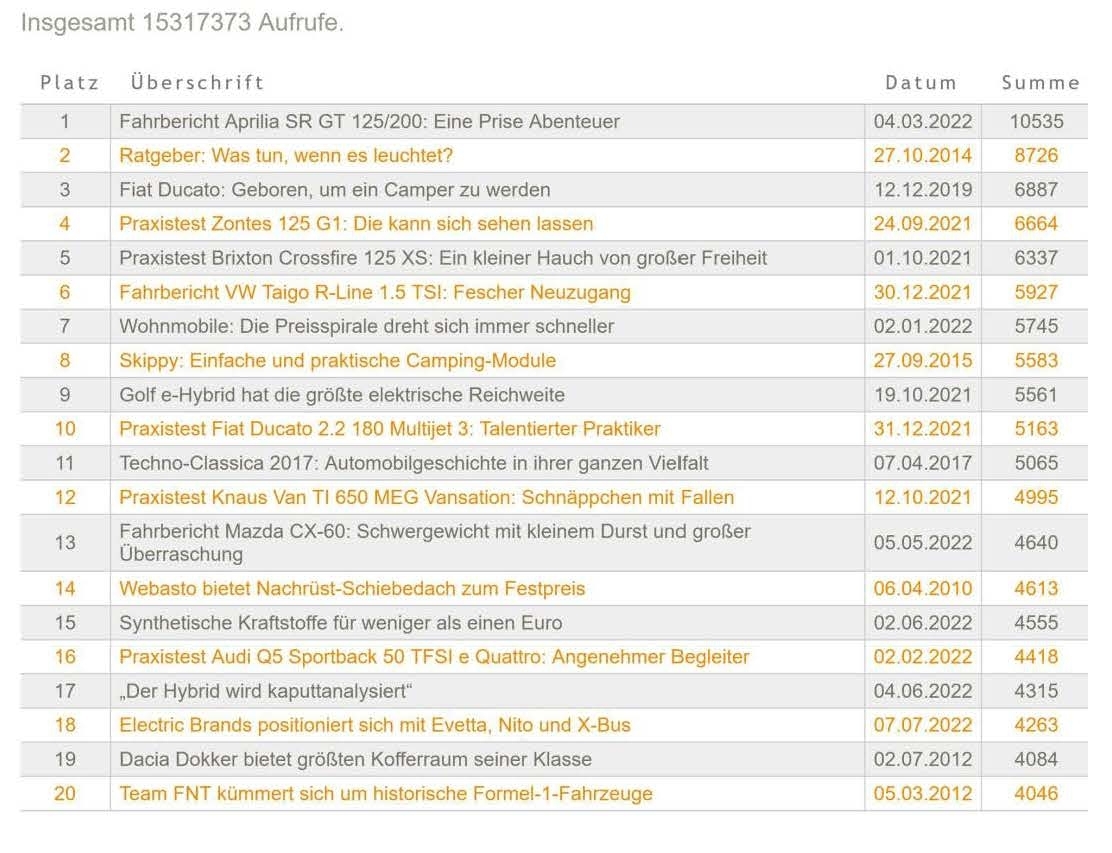 Erstaunlich, wie Zweirad- und Campingthemen bei den Texten um die Spitze rangeln. Bemerkenswert aber auch, wie alt mancher Eintrag ist, der ebenfalls nach oben drängt. Hier wird klar, wie oft die Foto-Datenbank zum Archiv wird. Der Effekt wiederholt sich beim Blick auf das Ranking der Fotos. In beiden Tabellen zeigen die großen Erfolge älterer Motive oder von Markensignets, wie wichtig die Nutzung unserer Datenbanken als Archiv ausfällt. Über die nun schon fast 20 Jahre entstand ein verlässliches Archiv mit mehr als 60.000 Texten, fast 210.000 Fotos und knapp 2500 Videos.