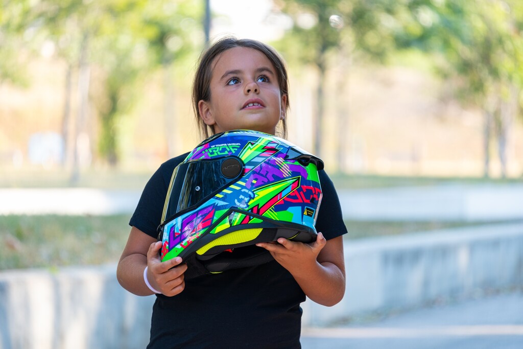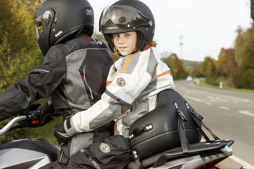 Selbstverständlich gilt die Helmpflicht auch für Kinder. Und ebenso die Vorgabe, dass der Schutz zur Kopfgröße passt und sämtlichen Sicherheitsvorschriften und Normen entspricht. Die GTÜ empfiehlt Erwachsenen und erst recht Kindern eindringlich, ausschließlich mit geeigneter und passender Schutzkleidung Motorrad zu fahren – spezielle Jacken, Hosen, Schuhe und Handschuhe, jeweils ausgestattet mit Protektoren. Dafür spricht allein die Vernunft. Außerdem kann Eltern im Falle eines Unfalls Fahrlässigkeit vorgeworfen werden, wenn Kinder nicht ausreichend geschützt worden sind.