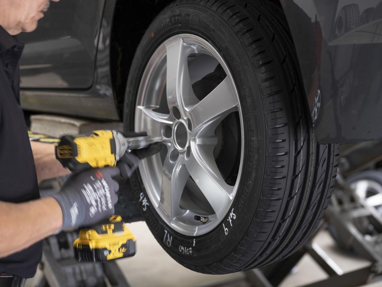 Doch wie fest sollen die Schrauben nun angezogen werden? Das passende Werkzeug ist ein einstellbarer Drehmomentschlüssel. Die Angabe für den notwendigen Festigkeitswert in Newtonmeter (Nm) findet sich in den Fahrzeugunterlagen oder Herstellerlisten im Internet. Sind die Felgen nachgerüstet, steht der Wert im dazugehörenden Gutachten. Bei Pkw üblich sind Werte zwischen 110 und 130 Nm. Ist der auslösende Drehmomentschlüssel korrekt eingestellt, macht er sich beim Anziehen der Schrauben beim Erreichen des Nennwerts mit einem deutlich vernehmbaren Knacken bemerkbar. Für das Nachziehen der Schrauben muss der Wagen nicht aufgebockt werden.