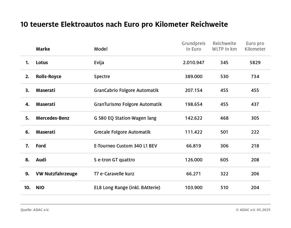 In der absoluten Luxusklasse wird das Verhältnis schließlich stark verzerrt: Bei dem teuersten Fahrzeug im Vergleich – dem Lotus Evija – lässt sich der Hersteller 345 Kilometer Reichweite mit über zwei Millionen Euro bezahlen. (aum)