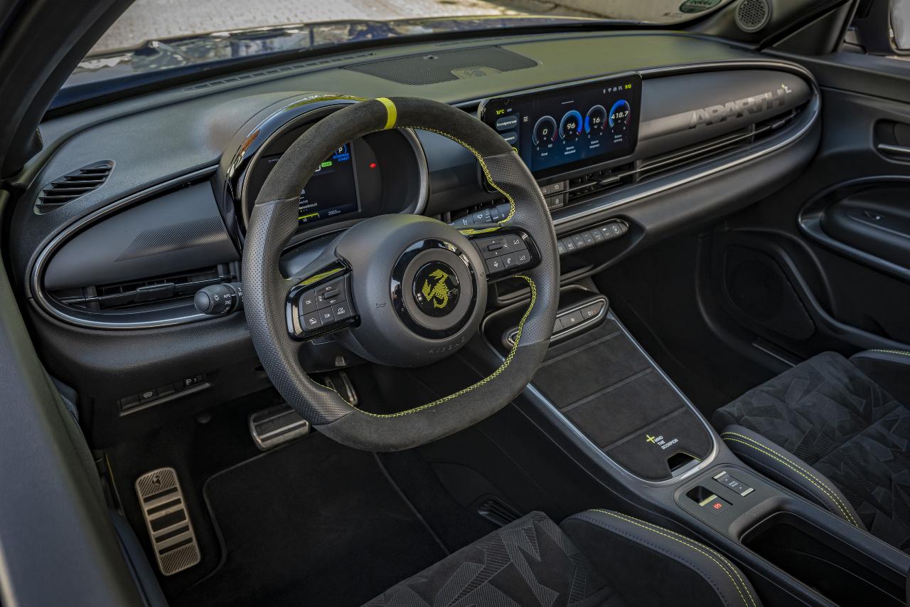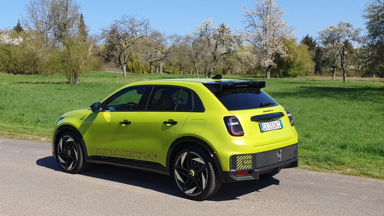 Der 600e zeigt schon im Stand, dass er nicht auf Kuschelkurs ist. Breite Backen, 20-Zoll-Schlappen und ein Spoiler, der eher nach Rundkurs als nach Stadtverkehr ruft. Innen geht’s sportlich weiter: Alcantara, Schalensitze, gelbe Nähte – die Designabteilung hatte sichtlich Spaß. Nur beim Materialmix schleicht sich viel Hartplastik ein. Dafür gibt’s außen wie innen jede Menge Skorpion-Logos – das Marken- und Sternzeichen des Firmengründers Carlo Abarth.