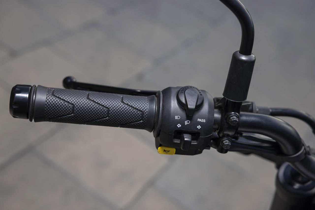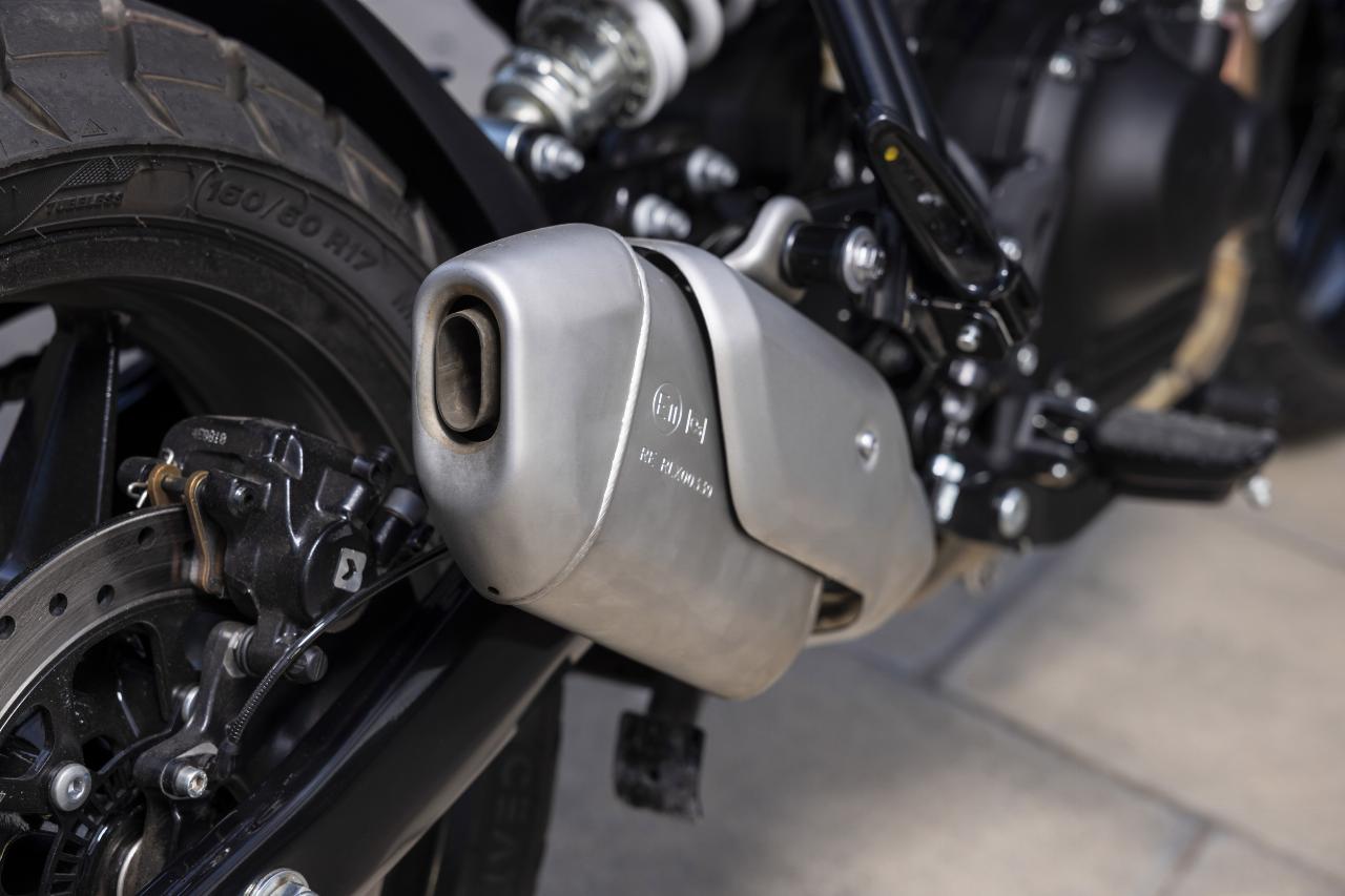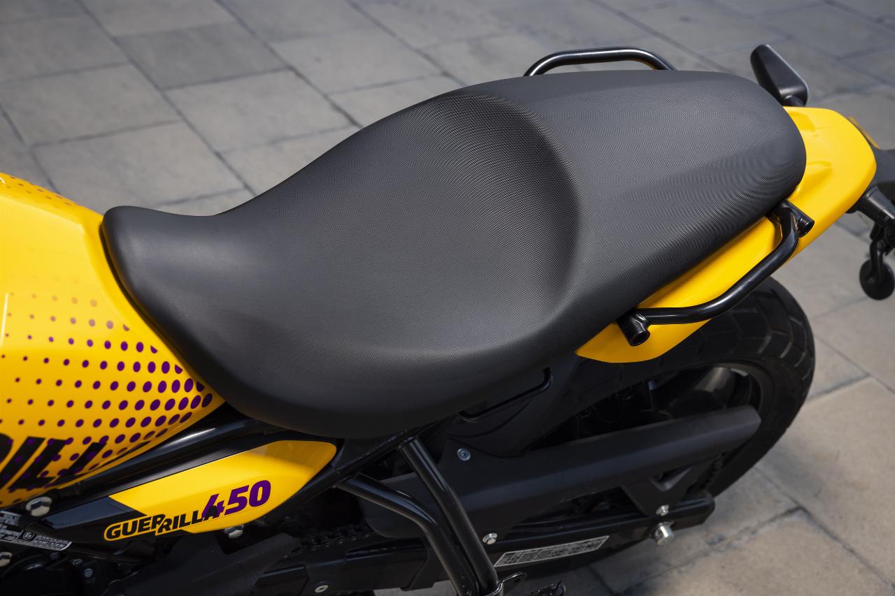Der Tank der Royal Enfield Guerilla 450 fasst elf Liter, die Sitzbank ist leicht abgestuft. Die GRR rollt auf 17-Zoll-Rädern, hat LED-Scheinwerfer und in die Blinker integrierte Rückleuchten. Sie verfügt über einen Eco- und einen Performance-Fahrmodus sowie einen USB-Anschluss. Das Gewicht beträgt fahrfertig 184 Kilogramm. Es wird drei Varianten geben. Der Basis Analogue kommt ohne TFT-Kombiinstrument und kostet 5290 Euro, die Topversion Flash ist lediglich 250 Euro teurer. Die Auslieferungen beginnen im August. (aum)