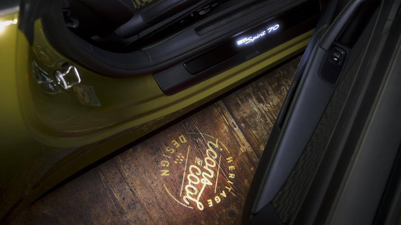 Eigens für den 911 Spirit 70 haben die Designer und Lackexperten von Porsche die Farbe Olive Neo kreiert – ein sattes, tiefes Grün. Einen spannenden Kontrast dazu bildet Bronzit. In diesem graugoldenen Farbton sind das Heckunterteil, das Bugteil und die Sport Classic Räder im „Fuchs“-Design lackiert. Das Verdeck ist schwarz, genauso wie der Windlaufrahmen. Drei schwarze Dekorstreifen auf der Fronthaube erinnern an die Sicherheitsbeklebung der Siebziger: Damals brachten Sportfahrer Längsstreifen auf den Karosserien ihrer schnellen Autos an, damit die Sportwagen bei hohen Geschwindigkeiten auf der Autobahn oder der Rennstrecke im Rückspiegel besser zu erkennen waren. Die Streifen werden auf dem Verdeck Ton-in-Ton fortgesetzt. An die sportliche Tradition der Marke knüpft die seitliche Dekorgrafik mit Porsche-Schriftzug und rundem Startnummernfeld („Lollipop“) sowie individueller Startnummer an.