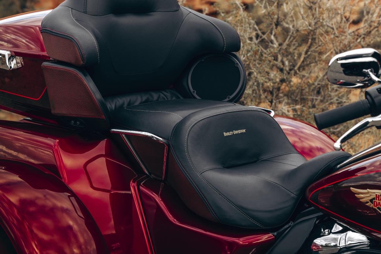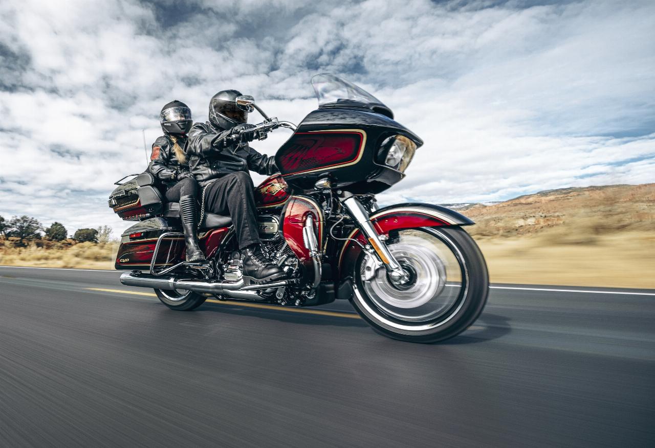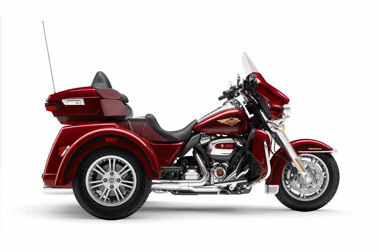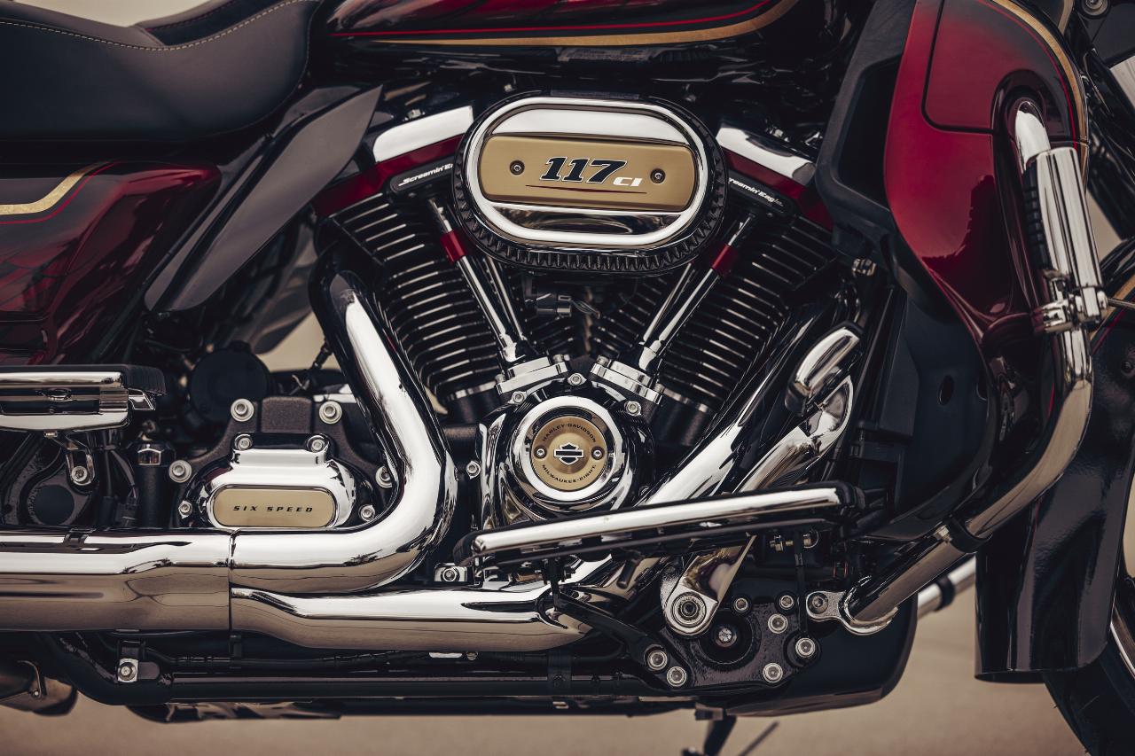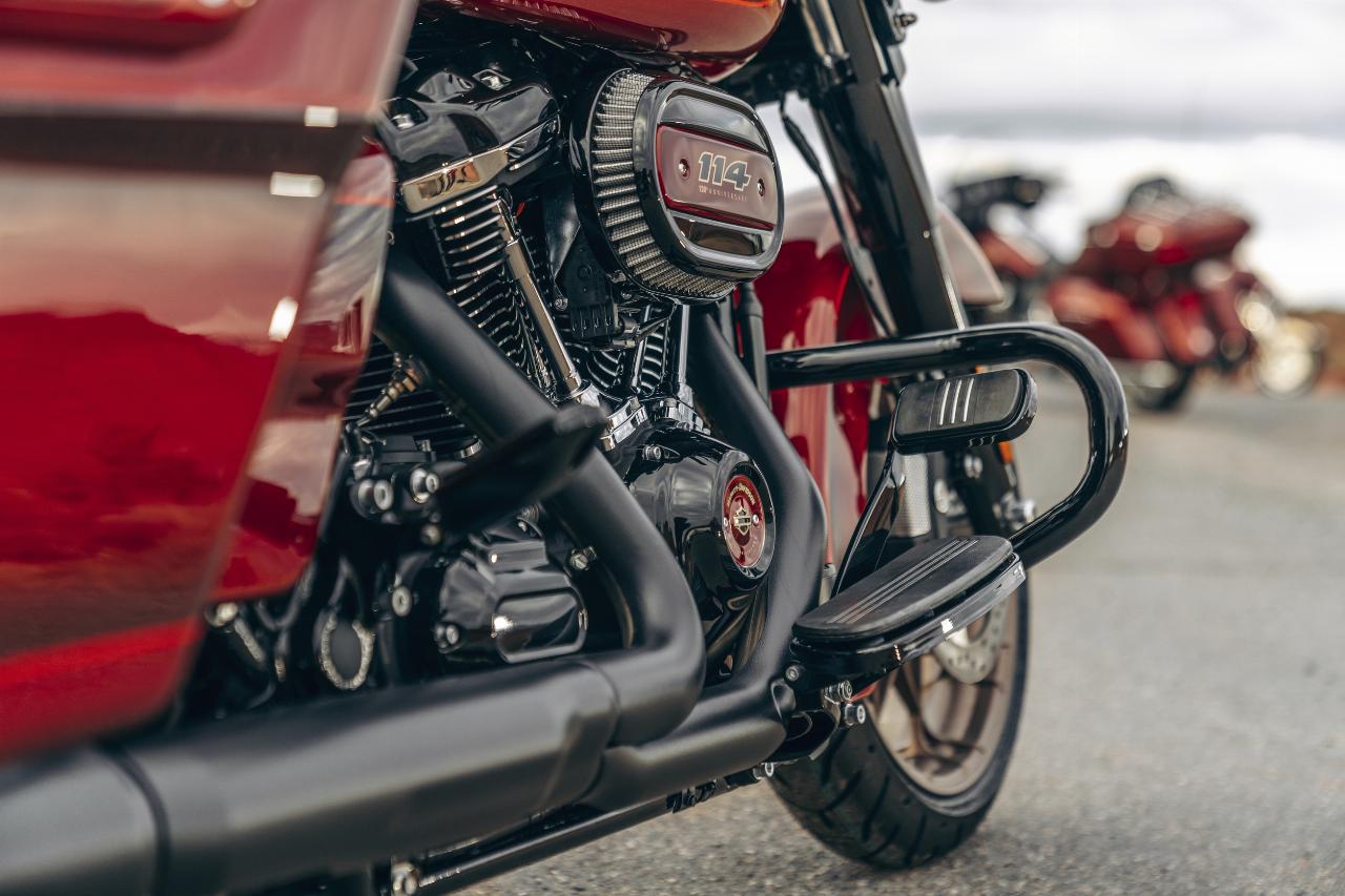 In ähnlichem Geburtstagsdress präsentieren sich die Anniversary-Ausgaben von Ultra Limited, Tri Glide Ultra, Street Glide, Road Glide, Fat Boy und Heritage Classic. Je nach Modell handelt es sich um Auflagen von 1100 bis 3000 Einheiten. Bei allen ist die Sonderlackierung von frühen Harley-Davidson-Motorrädern inspiriert. Hier bildet klassisches, glänzendes Heirloom Red bildet Basislack, der durch einen in Midnight Crimson gehaltenen Schattierungseffekt ergänzt und mit hellroten Pinstripes verziert ist. Das Markenlogo am Tank präsentiert ebenfalls einen Adler im Art-déco-Stil, die Sitze sind an den Flanken rot gefärbt und mit einem gestickten goldfarbenen Harley-Logo versehen, während der Antriebsstrang Inserts in Red Fade trägt. (aum)