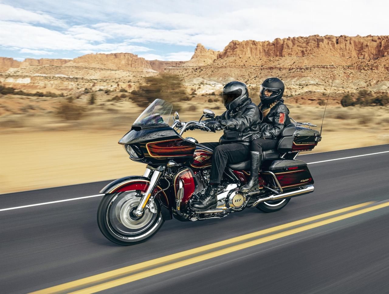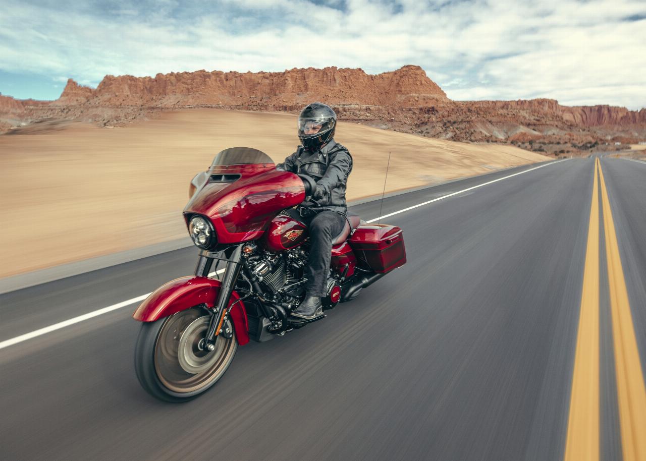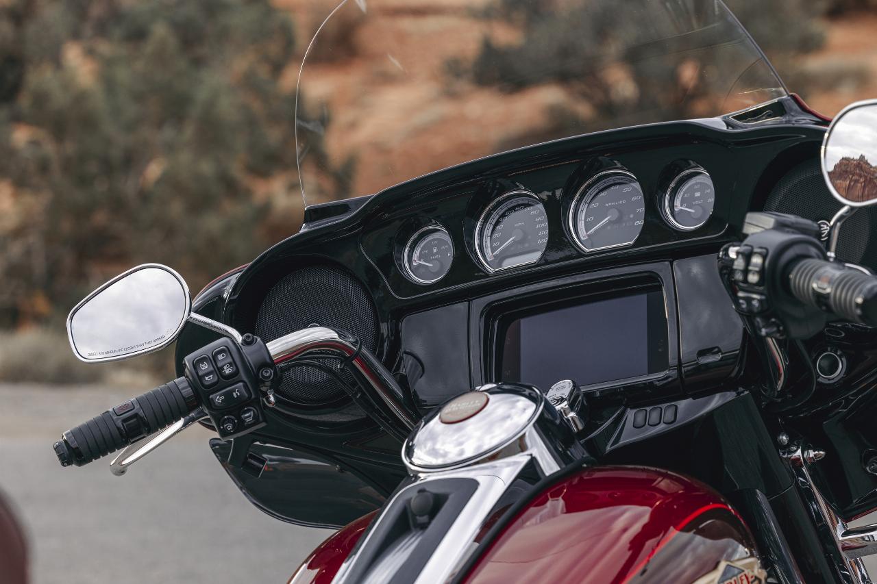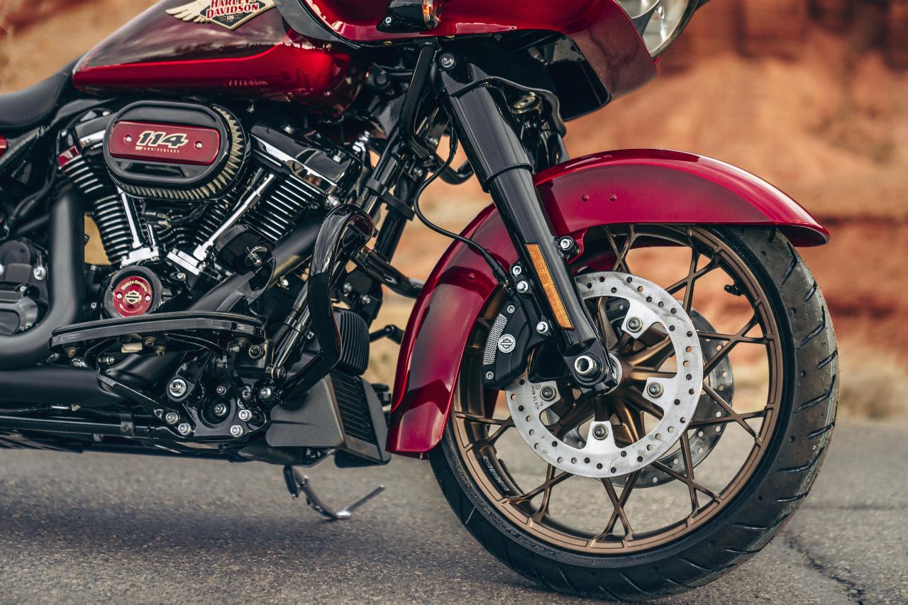 In ähnlichem Geburtstagsdress präsentieren sich die Anniversary-Ausgaben von Ultra Limited, Tri Glide Ultra, Street Glide, Road Glide, Fat Boy und Heritage Classic. Je nach Modell handelt es sich um Auflagen von 1100 bis 3000 Einheiten. Bei allen ist die Sonderlackierung von frühen Harley-Davidson-Motorrädern inspiriert. Hier bildet klassisches, glänzendes Heirloom Red bildet Basislack, der durch einen in Midnight Crimson gehaltenen Schattierungseffekt ergänzt und mit hellroten Pinstripes verziert ist. Das Markenlogo am Tank präsentiert ebenfalls einen Adler im Art-déco-Stil, die Sitze sind an den Flanken rot gefärbt und mit einem gestickten goldfarbenen Harley-Logo versehen, während der Antriebsstrang Inserts in Red Fade trägt. (aum)