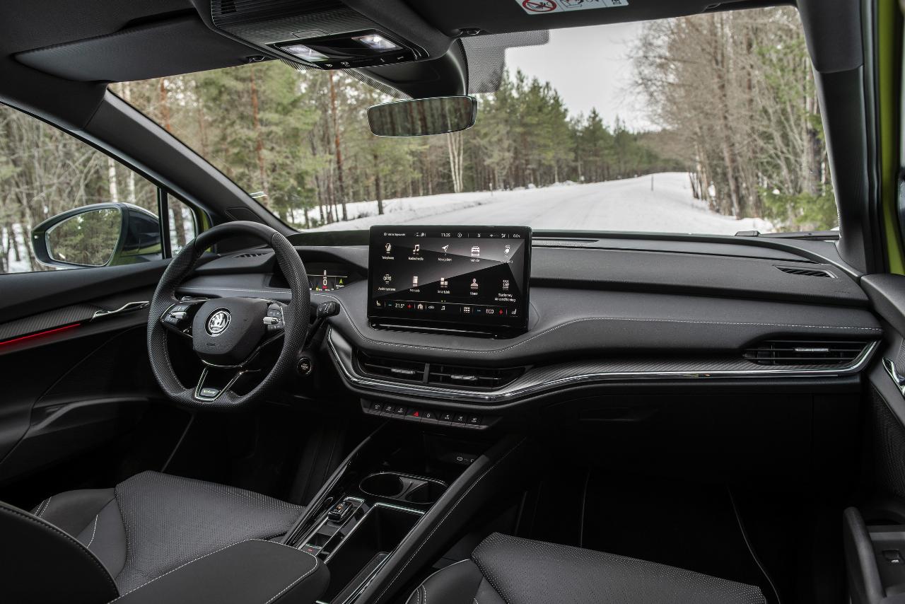 Auch beim Enyaq werden alle vier Räder nur dann angetrieben, wenn der Gripp auf einer Achse nachlässt. Die Allrad-Technik arbeitet bedarfsgerecht und schaltet erst in den 4x4-Betrieb um, wenn sie auch wirklich gebraucht wird. Daher arbeitet der so genannte Allrad on Demand höchst effizient und spart Energie. Im Falle unseres 220 kW (299 PS) starken Enyaq RS Strom. Vom auferlegten Konsumverzicht ist beim Fahren glücklicherweise nichts zu spüren. Im Gegenteil. In Verbindung mit seinen beiden E-Maschinen, aber auch den in Schweden erlaubten Spike-Reifen krallt sich das sportliche RS-Modell förmlich ins Eis und nimmt selbst tief verschneiten Streckenabschnitten ihren Schrecken.