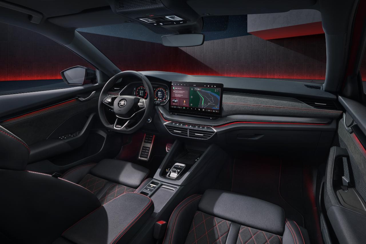 Neben neuen und umweltschonenden Materialien für Sitze, Armaturenträger und Türverkleidungen gehört je nach Version auch das zehn Zoll große digitale Cockpit zur Serienausstattung. Das bekannte Digital Cockpit Plus, das in der dritten Generation des Octavia debütierte, bleibt als Option im Angebot. Auf Wunsch können die Kunden erstmals für den Octavia ein 13 Zoll großes Infotainmentdisplay ordern. Den KI-basierten Chatbot Chat-GPT integriert Škoda zu einem späteren Zeitpunkt serienmäßig in die digitale Sprachassistentin Laura.