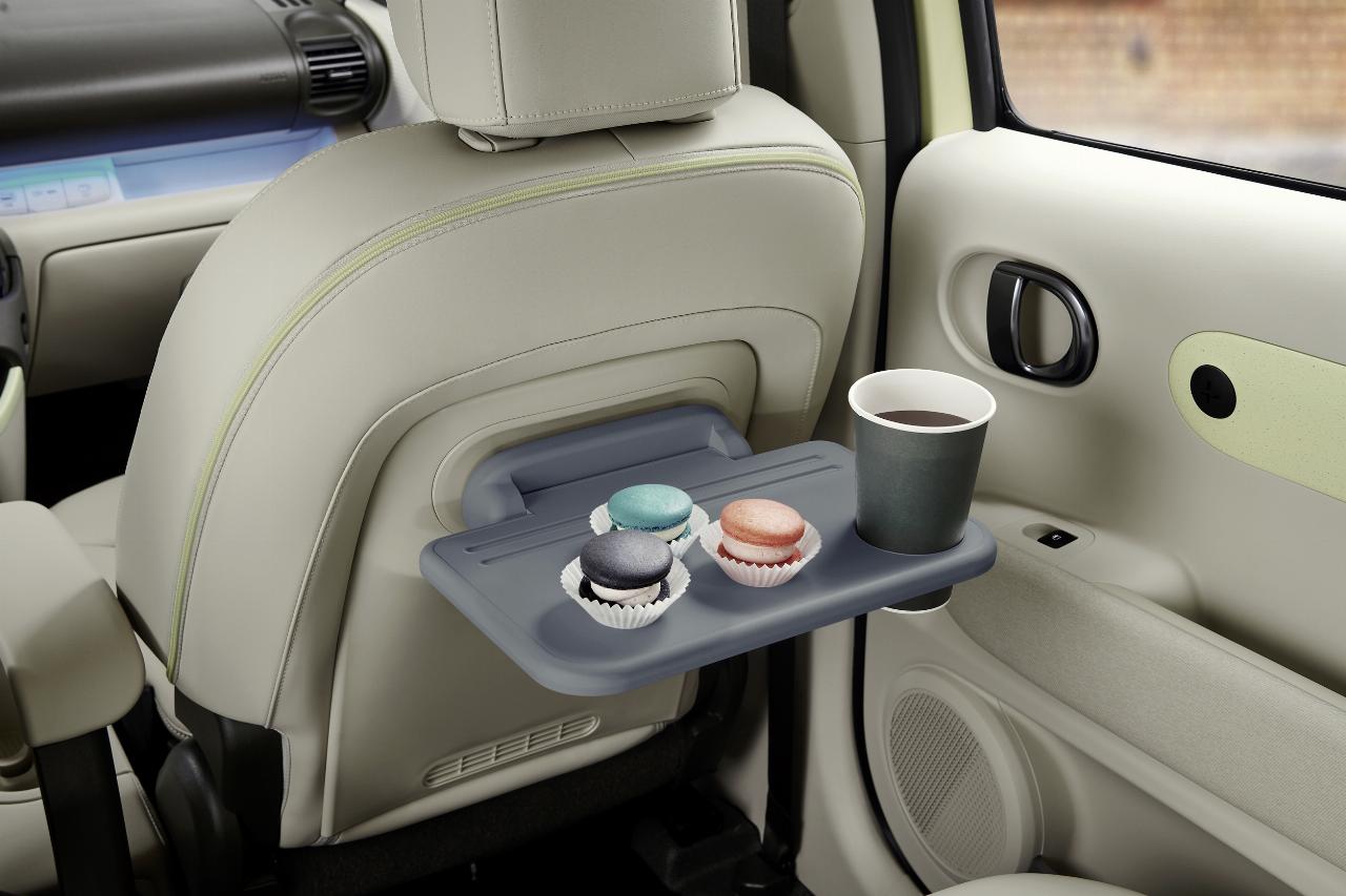 So schafft etwa schon eine Ablage für die umgeklappte Rückenlehne zusätzlichen Platz und kann als Arbeitsfläche oder Ablagefläche für verschiedene Gegenstände dienen. Für den Einsatz mit der aufgestellten Rückenlehne bietet sich ein anklemmbarer Tisch an, der als Ablage für Tablet, Laptop, Snacks oder Malbuch genutzt werden kann. Das Vehicle-to-Load-Equipment ermöglicht, Strom via Haushaltssteckdose aus dem Fahrzeug zu ziehen, um Geräte wie Laptops oder Campingausrüstung auch auf Reisen zu betreiben.