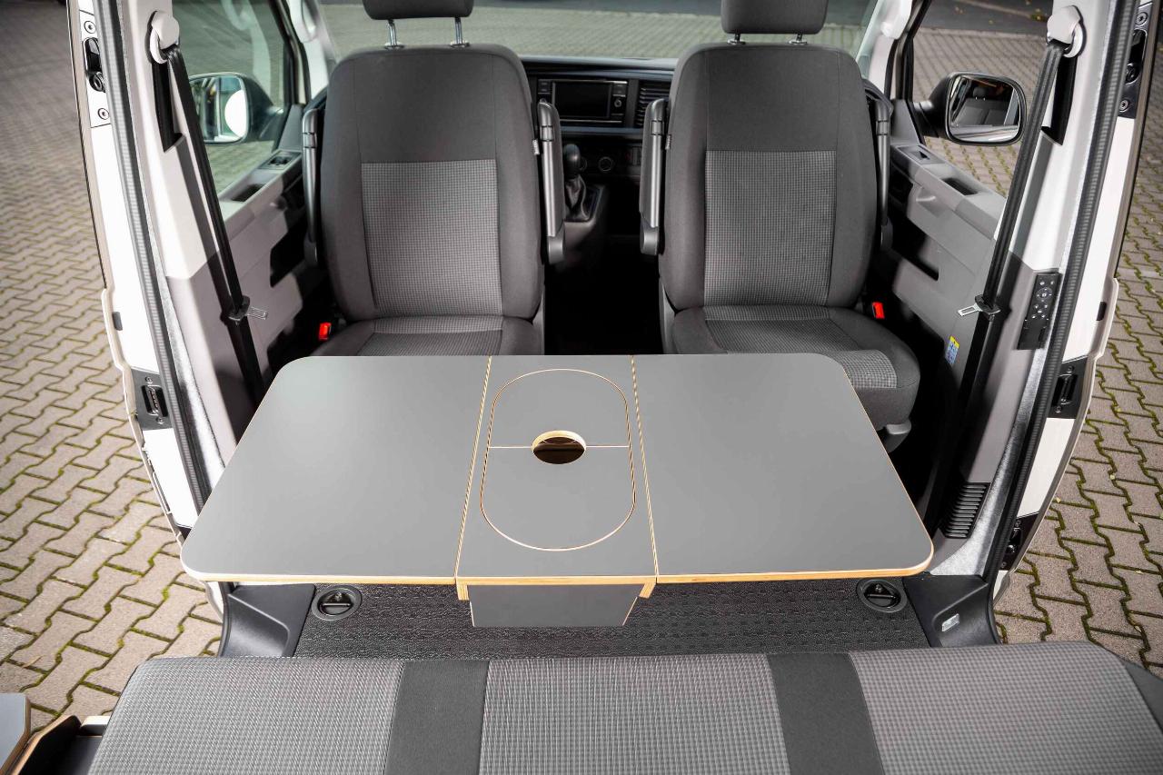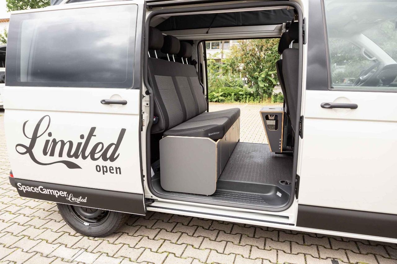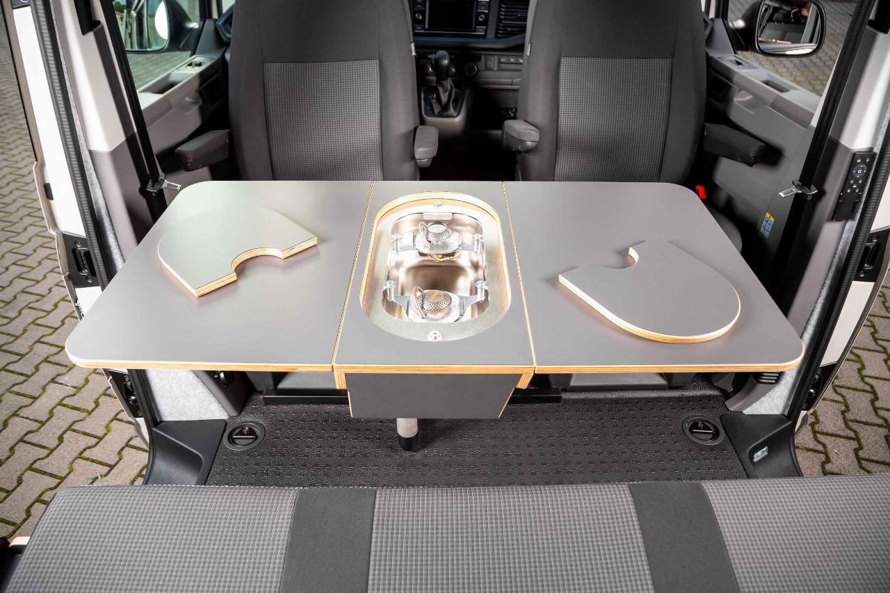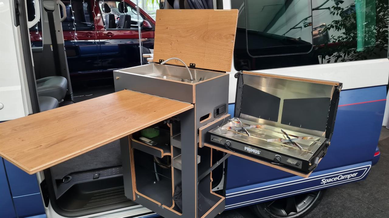 In der Tat lässt sich die patentierte Konstruktion – Kernstück eines jeden Space Camper – in Sekundenschnelle umklappen. Schlafsack drauf, fertig ist das Bett mit den Maßen 2,05 mal 1,65 Meter. Vor allem mit seiner Breite findet die Liegefläche Gefallen. Da die Küche anderenorts eingebaut wird, bietet das Space-Camper-Bett 25 Zentimeter mehr als der Klassiker California von Volkswagen Nutzfahrzeuge. Der Tisch davor ist nicht nur Tisch. Über einen Öldruckdämpfer wird er in Position gebracht und arretiert, auf Wunsch findet sich unter zwei Abdeckplatten in seiner Mitte eine Kochstelle mit zwei Gasflammen und eine Minispüle. Freiluftkochen geht auch, entweder mit einem schwenkbaren Küchenmodul, das im Modell Limited Open durch die serienmäßige zweite Schiebetür auf der Fahrerseite ins Freie gleitet. Alternativ gibt es eine komplette Küche mit Wasserversorgung, Kocher und Kühlbox auch als Auszug im Heck, die geöffnete Heckklappe und ein maßgeschneidertes Zelt schützen vor Regen und Wind.