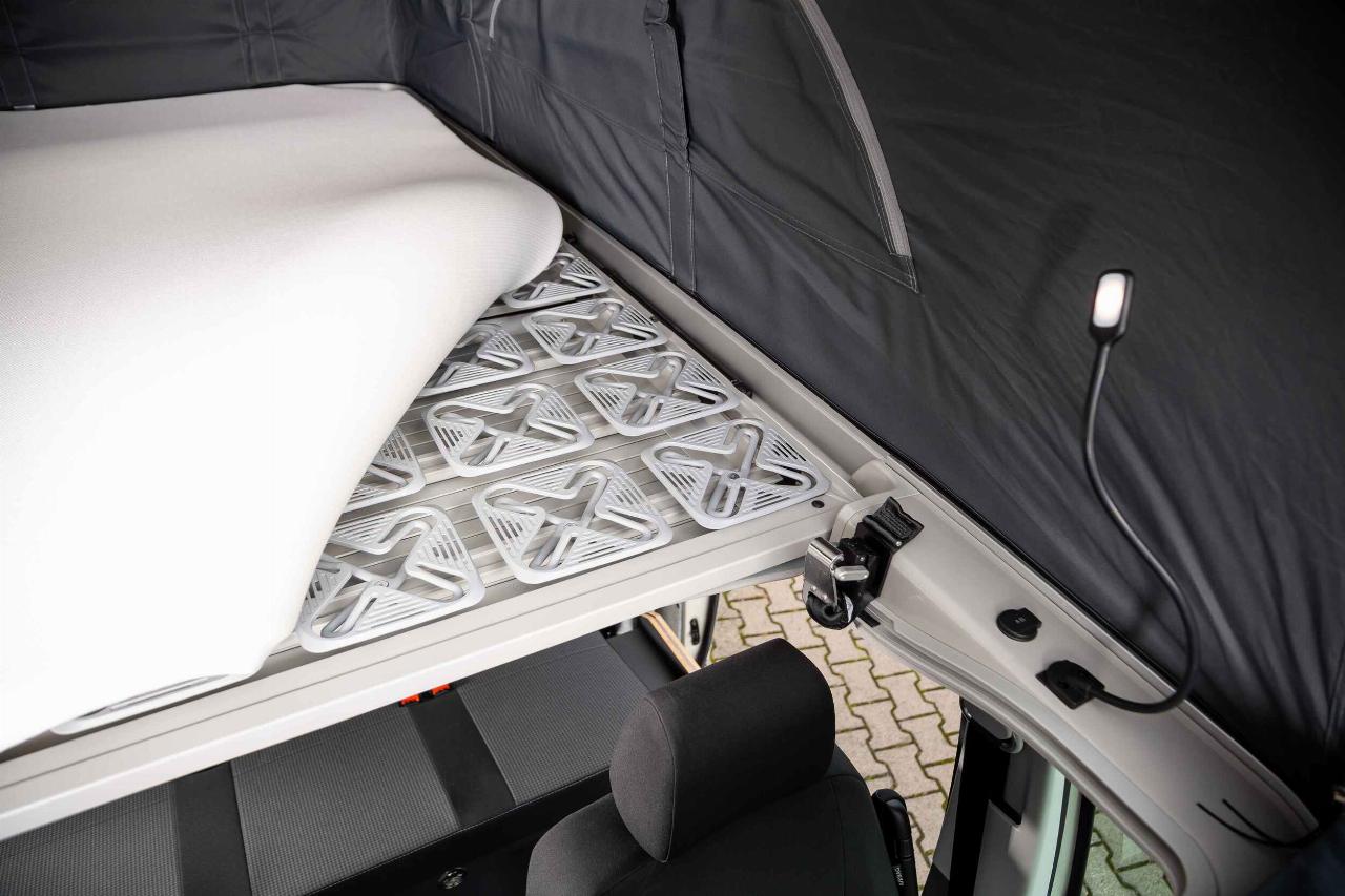 Das einzige Ausbauteil des Reisemobils, das die Darmstädter nicht selber herstellen, ist das Original-Klappdach von VW, so wie es auch im California eingebaut wird. Die 2,0 mal 1,20 Meter große Matratze liegt auf Tellerfedern, neben den Seitenfenstern gibt es den großen Panorama-Ausschnitt im vorderen Zeltstoff, der sich vollständig öffnen lässt. Auch die Markisenleiste ist auf beiden Seiten des Wagens vorhanden, man denkt eben an die zweite Schiebetür.