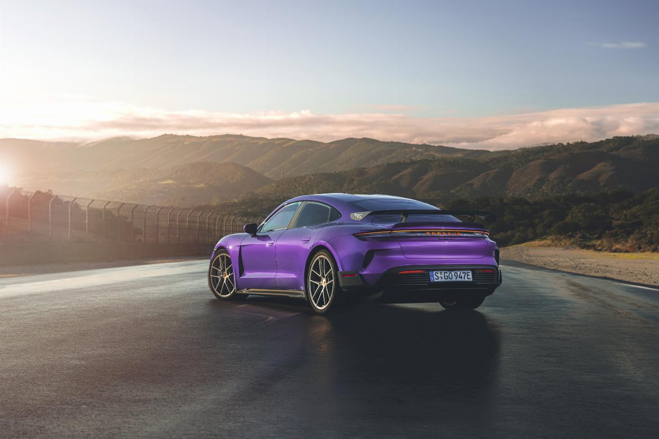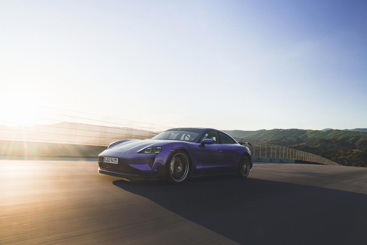 Porsche legt beim Taycan und bringt mit dem Turbo GT und Turbo GT mit Weissach-Paket sein bislang stärkstes Serienfahrzeug überhaupt auf den Markt. Dank eines stärkeren Pulswechselrichters haben beide Modelle eine Nennleistung von 580 kW (788 PS), kommen im Overboost auf bis zu 760 kW (über 1000 PS) und für zwei Sekunden sogar auf bis zu 815 kW (1108 PS). Auf der Rennstrecke im kalifornischen Laguna Seca hat Entwicklungsfahrer Lars Kern mit dem Taycan Turbo GT mit Weissach-Paket die schnellste jemals mit einem straßenzugelassenen Elektroauto zurückgelegte Runde zurückgelegt. Er benötigte 1:27,87 Minuten.