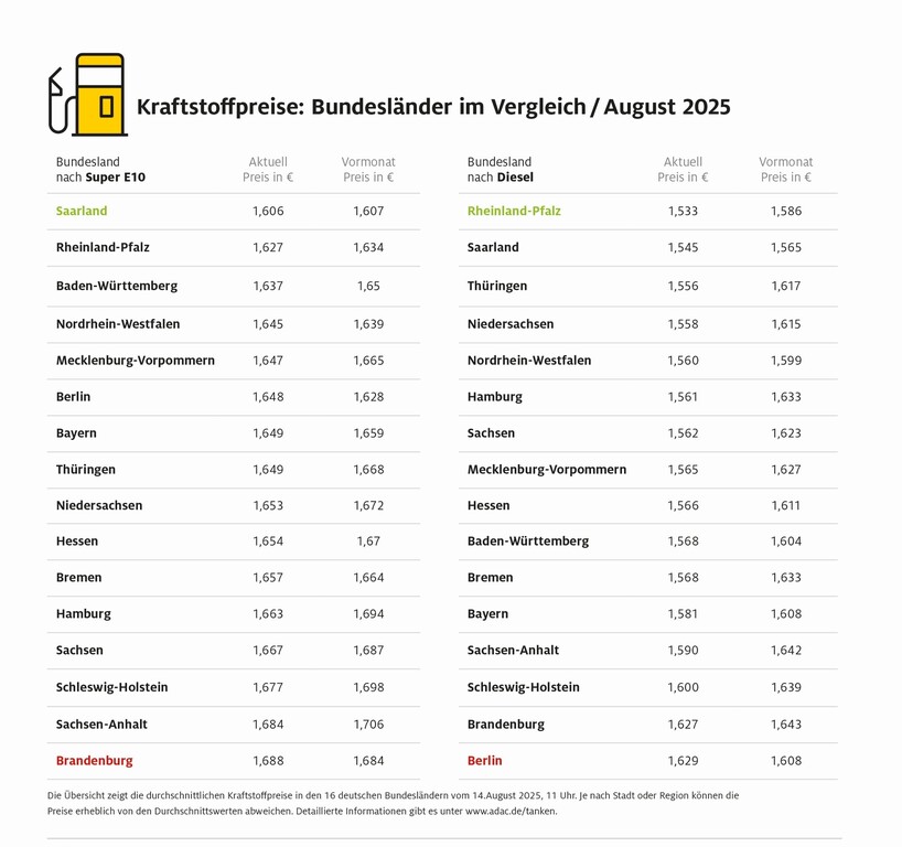 Die Preisunterschiede zwischen den günstigsten und den teuersten Bundesländern sind momentan erheblich. Während im Saarland ein Liter Super E10 im Schnitt 1,606 Euro kostet, ist beim Schlusslicht Brandenburg 1,688 Euro fällig – eine Differenz von 8,2 Cent. Noch größer ist der Preisunterschied bei Diesel: Während in Rheinland-Pfalz für einen Liter im Mittel 1,533 Euro verlangt wird, sind es in Berlin mit 1,629 Euro und damit fast zehn Cent mehr.