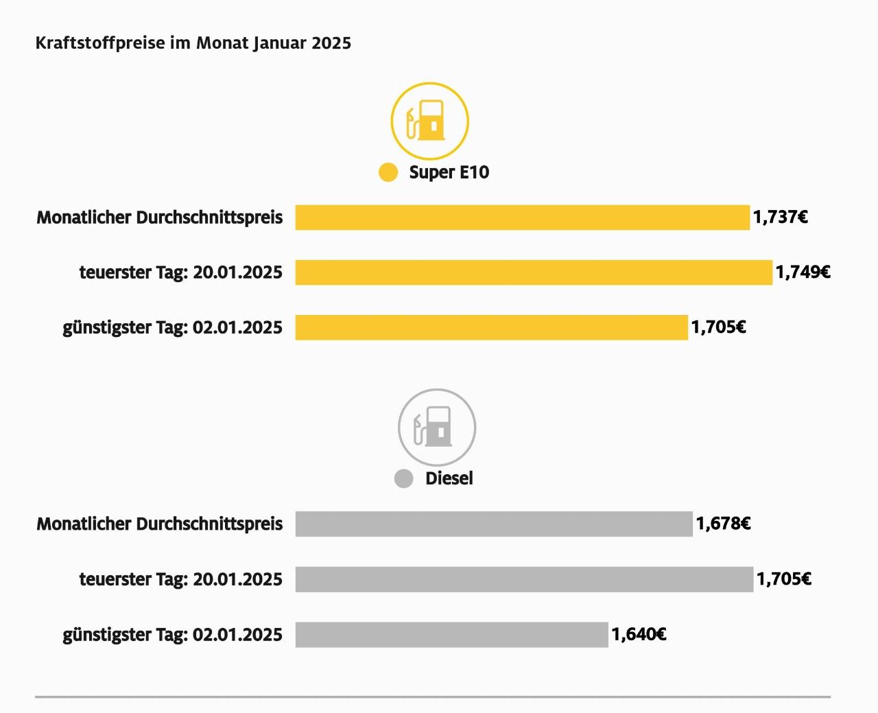 Beide Kraftstoffsorten waren am 20. Januar am teuersten. Für Super E10 musste an diesem Tag im Mittel 1,749 Euro je Liter bezahlt werden, für Diesel 1,705 Euro. Am günstigsten tankten Kraftfahrer am 2. Januar: Der Preis für einen Liter Super E10 lag an diesem Tag bei 1,705 Euro, für Diesel bei 1,640 Euro.