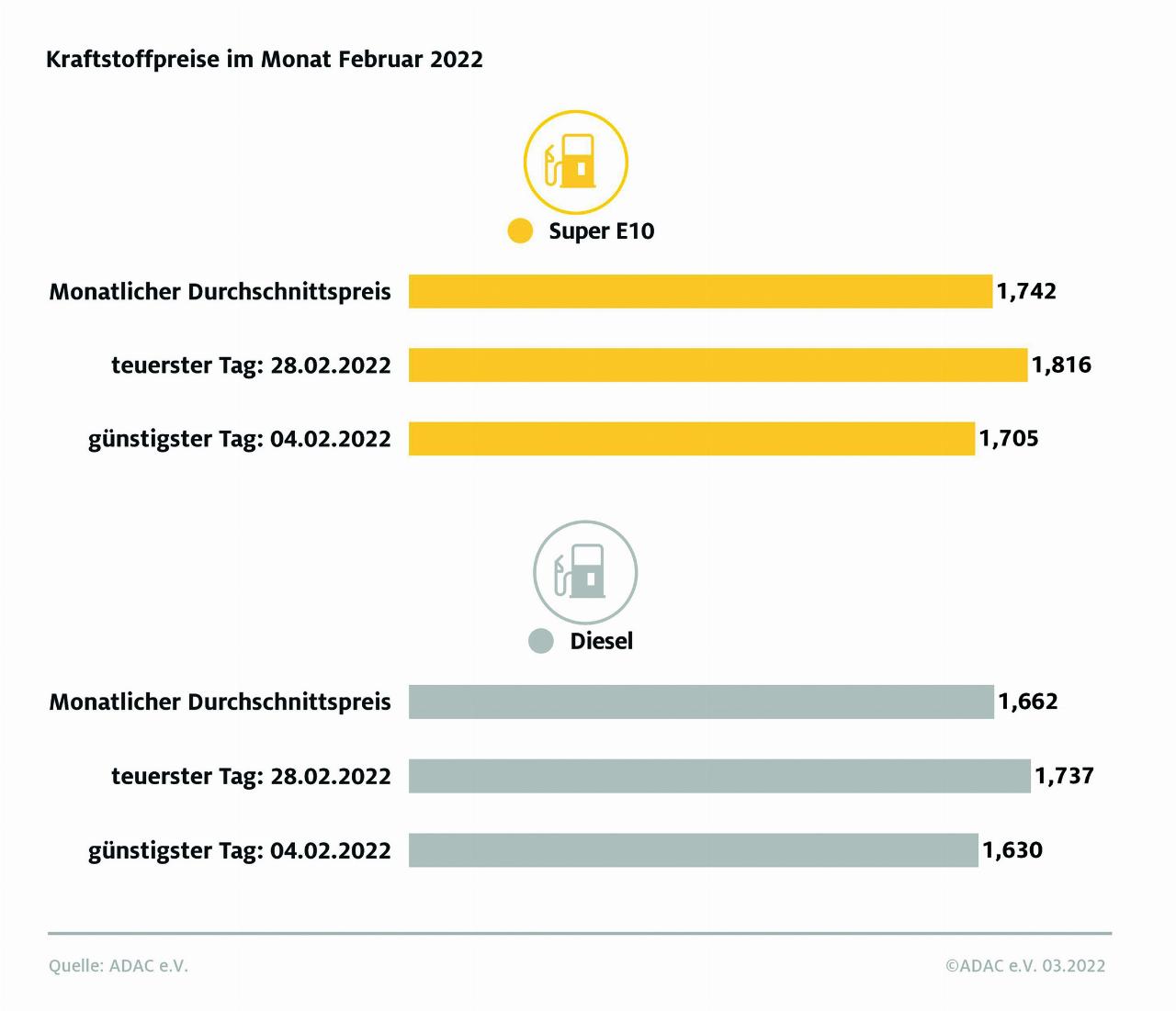 Auch Diesel war am 28. Februar so teuer wie noch nie. Ein Liter kostete im Tagesdurchschnitt 1,737 Euro und damit 10,7 Cent mehr als am 4. Februar, als Diesel mit 1,630 Euro am preiswertesten war.