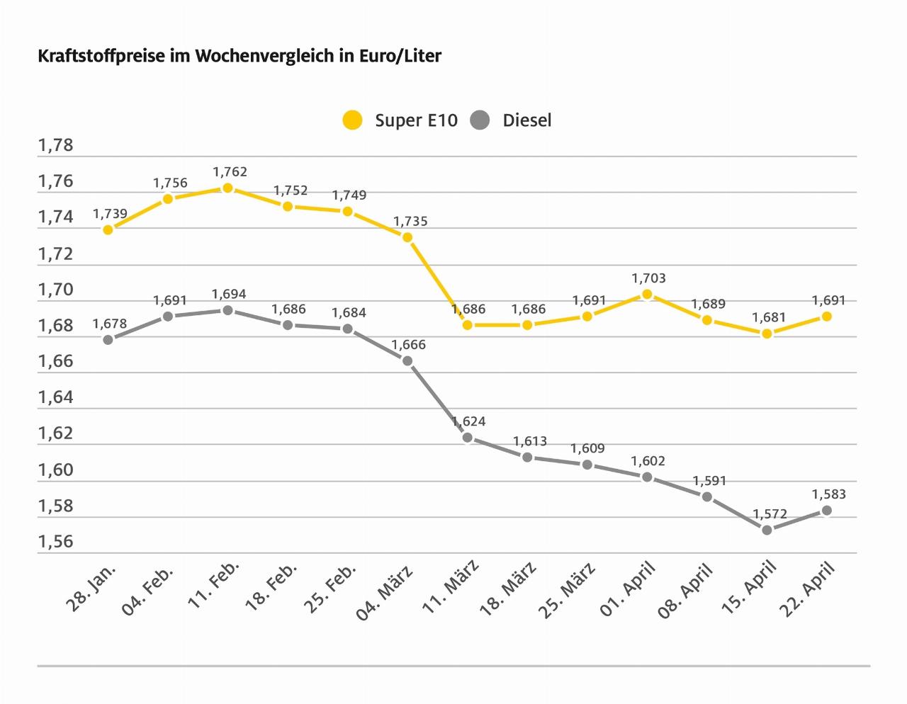 Die Ursache für den Preisanstieg ist aus Sicht des ADAC zum Teil darin zu sehen, dass der Preis für Rohöl gegenüber der Vorwoche leicht gestiegen ist und der Euro im Verhältnis zum US-Dollar etwas schwächer notiert. Dieselfahrer dürften sich aber weiterhin über den zu geringen Preisabstand zum Benzin ärgern. Die Differenz zwischen den beiden Sorten hat sich auf 2,8 Cent verringert. Rein steuerlich müsste ein Liter Diesel an der Zapfsäule etwa 20 Cent günstiger sein als ein Liter Super E10.